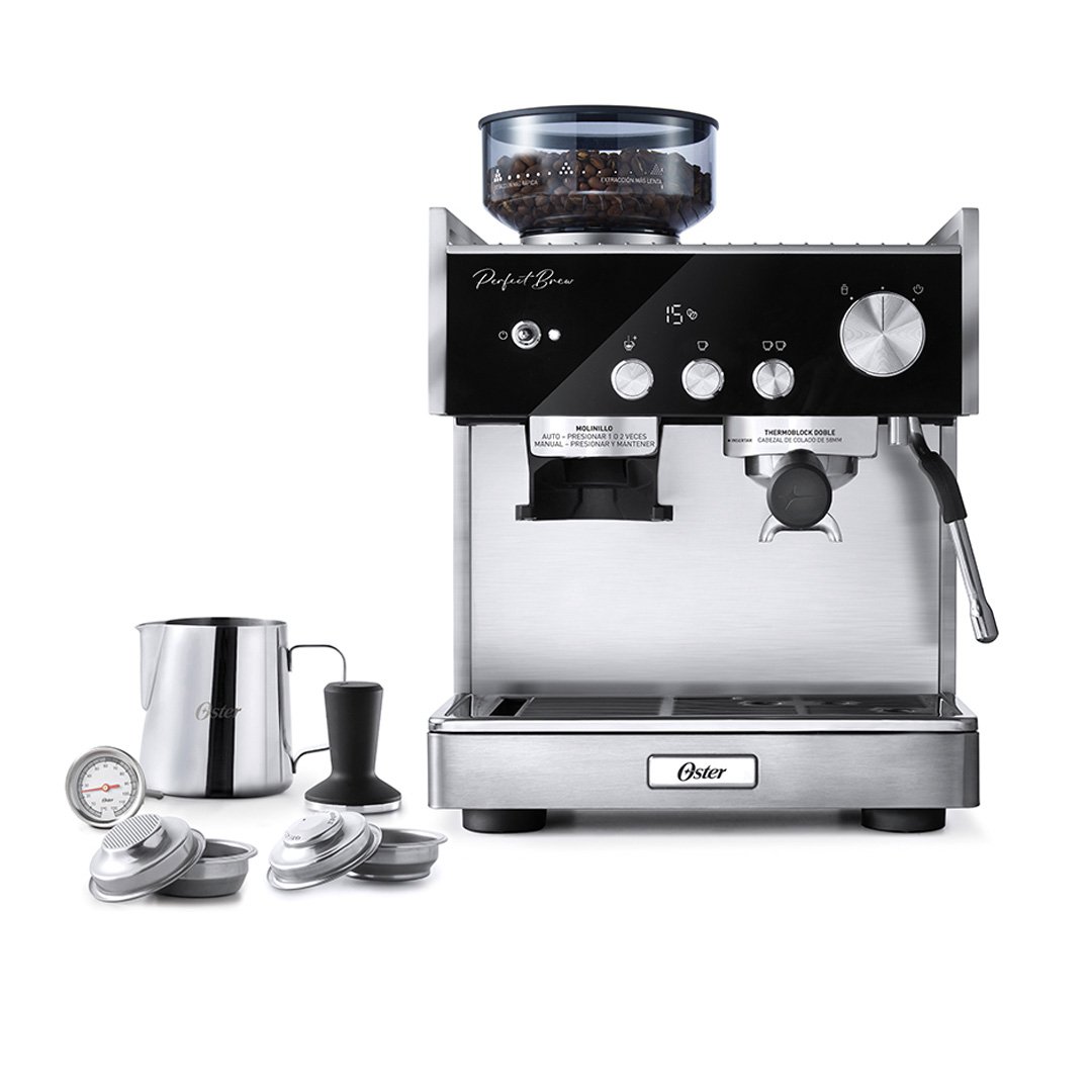Viene con accesorios profesionales: filtros simples y presurizados para 1 y 2 tazas, jarra y termómetro de leche, aplanador de café y pin de limpieza. Tanque de agua de 2800 ml para mayor autonomía.