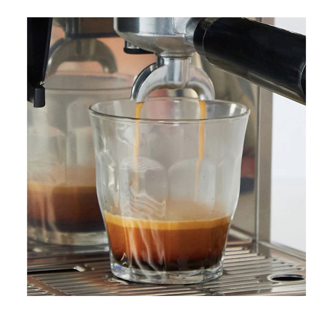 Incluye portafiltro comercial de 58 mm, bomba italiana de 15 bares, sistema de preinfusión y pantalla LED con temporizador para una extracción precisa y un espresso más cremoso. El tubo de vapor de acero inoxidable permite crear microespuma sedosa, y el equipo incorpora alertas de limpieza y mantenimiento.