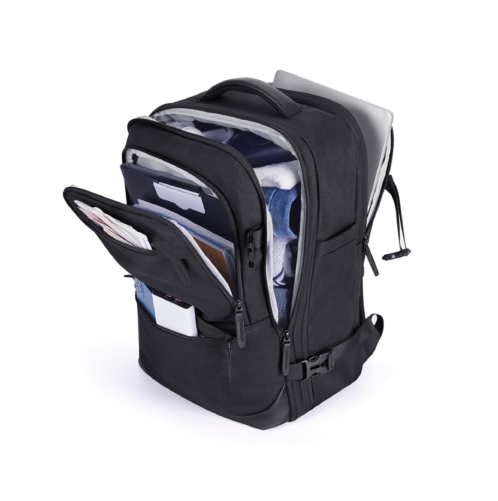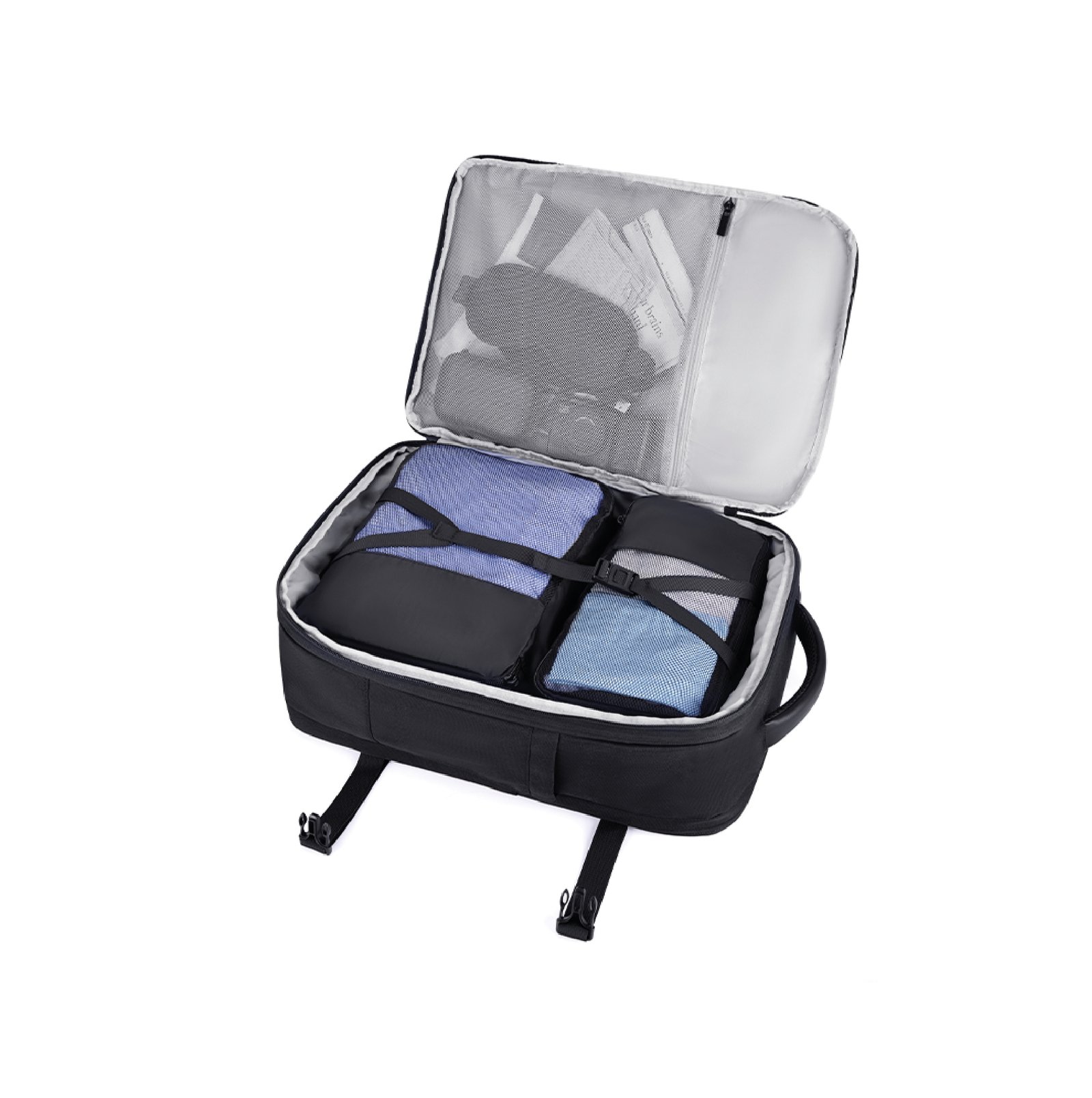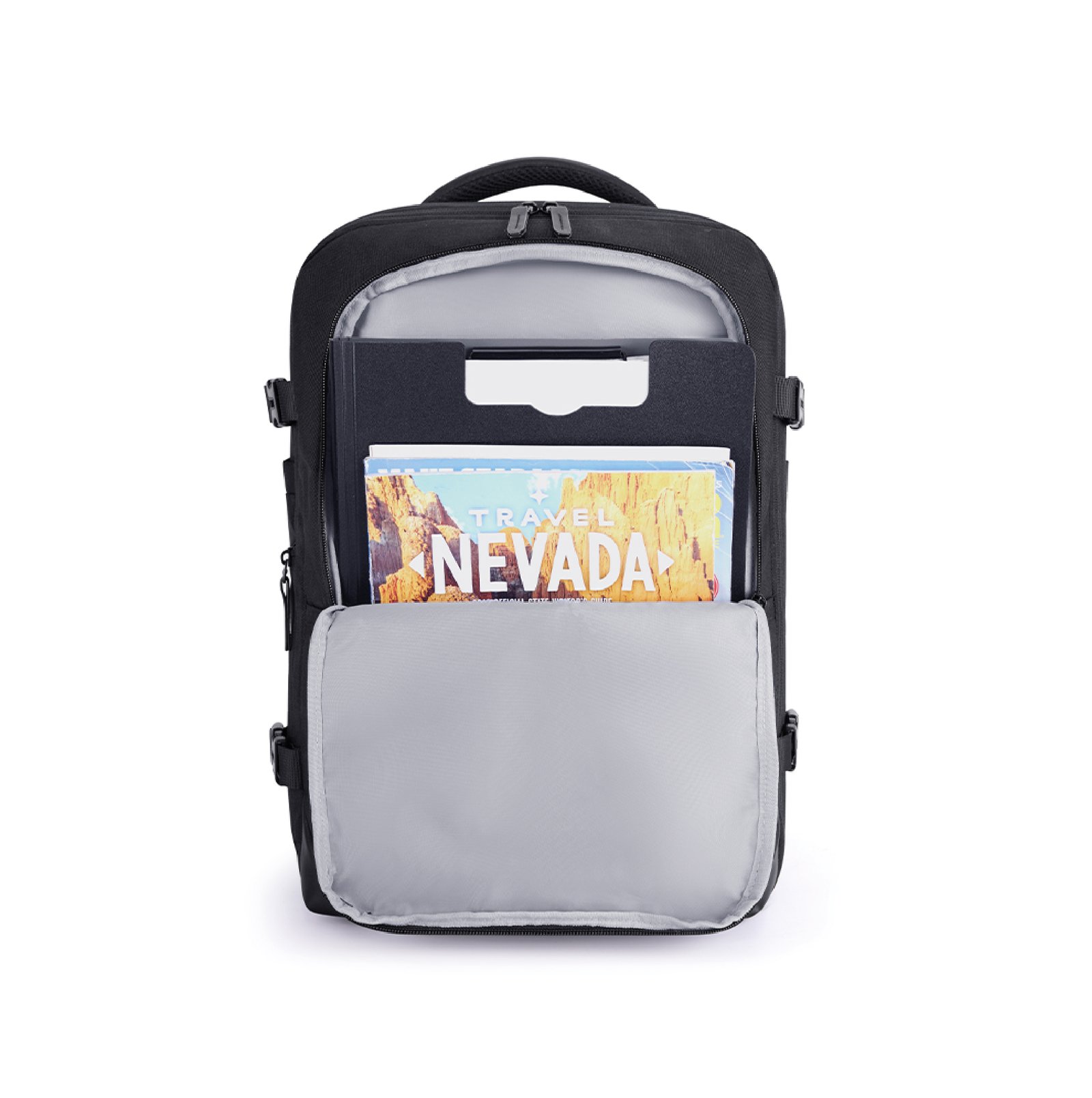 Mochila ideal para viajes, con capacidad de hasta 40L, expandible 5cm de alto (de 25 a 40 litros). Cabe en el compartimiento superior del avión y debajo del asiento delantero. Cuenta con 2 bolsas para guardar ropa y 1 bolsa para zapatos. Prácticos bolsillos exteriores, compartimiento frontal y porta notebook de hasta 17,3″. Cómoda correa trasera para enganchar la valija y hebilla ajustable en el pecho. Fabricada en poliéster resistente al agua.