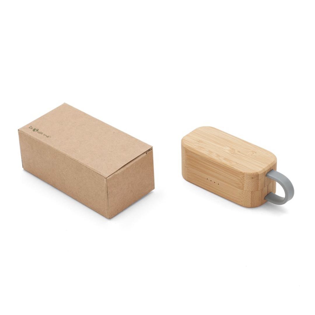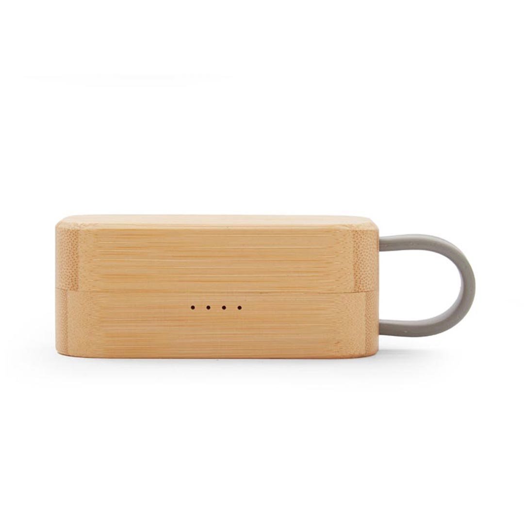 Auriculares inalámbricos con estuche de carga y micrófono incorporado. Posee tecnología bluetooth 5.0. La capacidad de carga es de 300mA y su duración en funcionamiento es de 3-5 horas seguidas. Estuche fabricado en ABS, bamboo y silicona gris, incluye cable. Medidas: 9,5 x 3,5 x 3,5 cm.