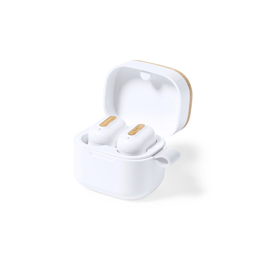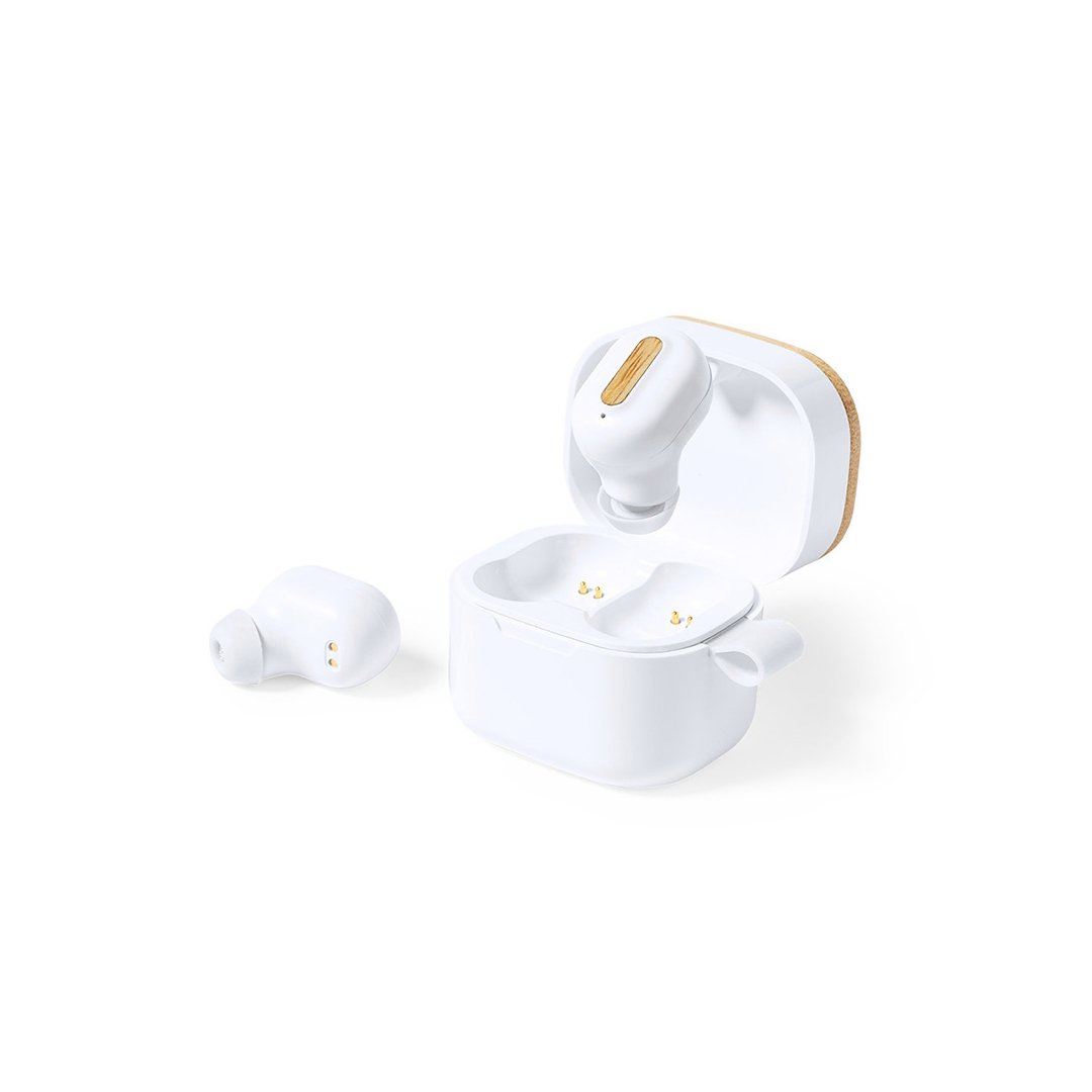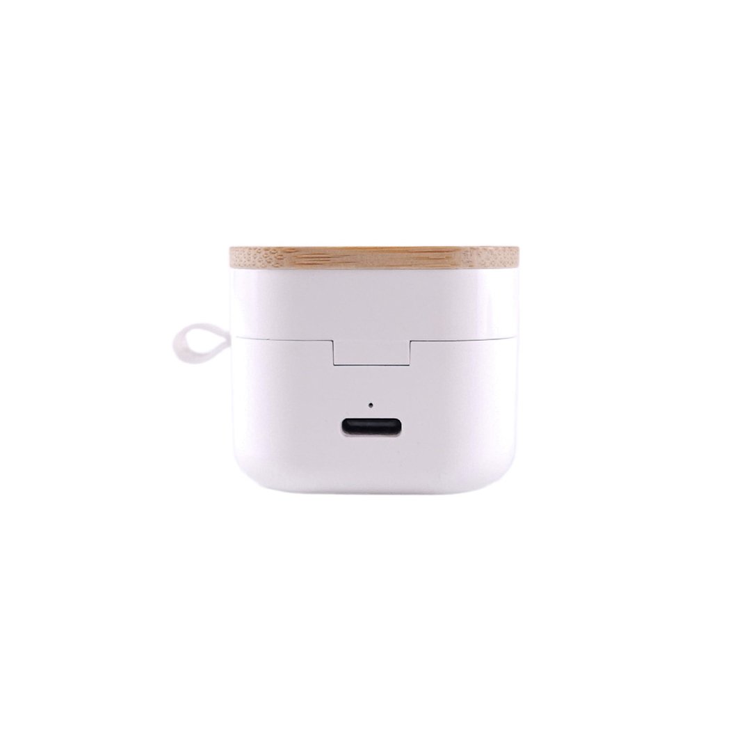 Auriculares inalámbricos fabricados en RABS, bambú y silicona. Cada auricular cuenta con un botón touch que permite contestar y finalizar llamadas, reproducir y pausar música, cambiar a la siguiente o anterior canción. Tienen tecnología Bluetooth 5.3, una duración de batería de aproximadamente 4 horas y un estuche de carga de 300 mAh, el cual se carga a través de un cable usb c. Los auriculares cuentan con almohadillas de diferentes tamaños.