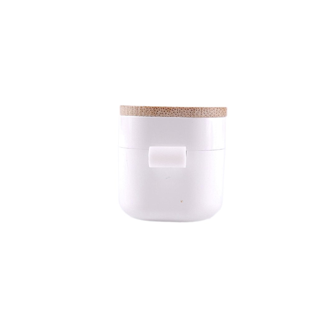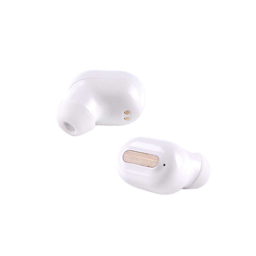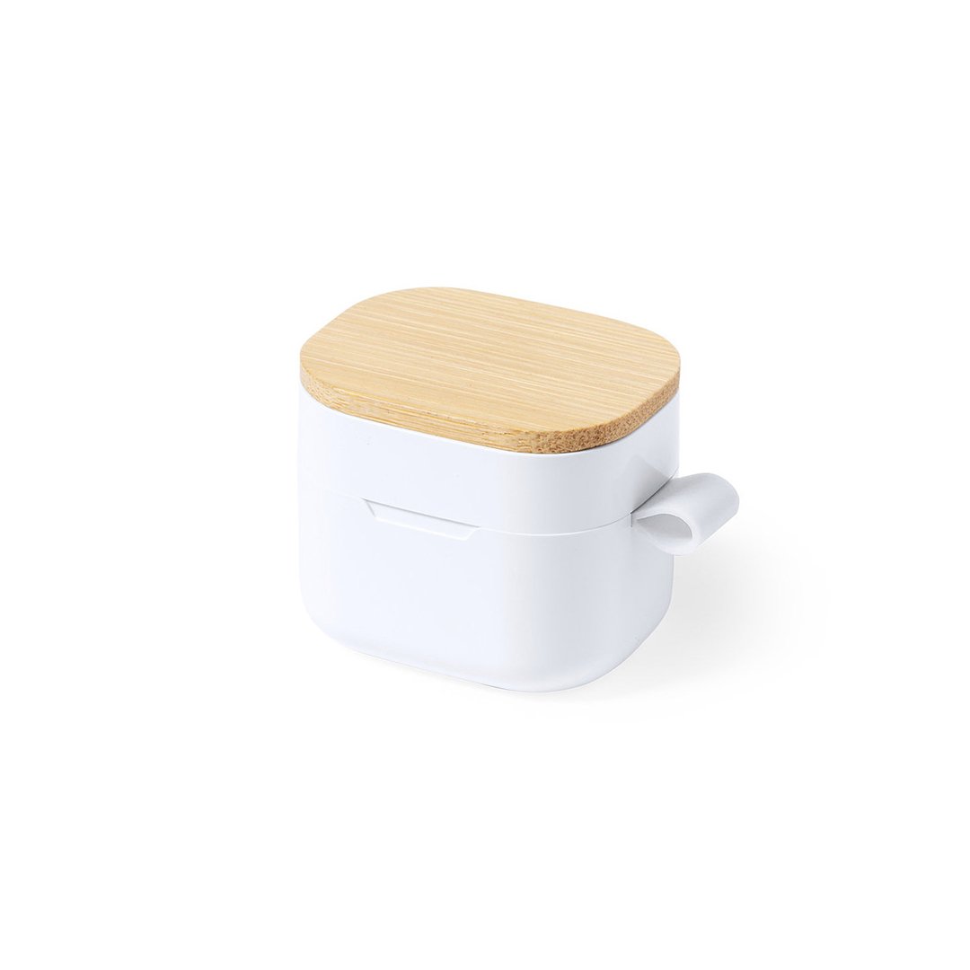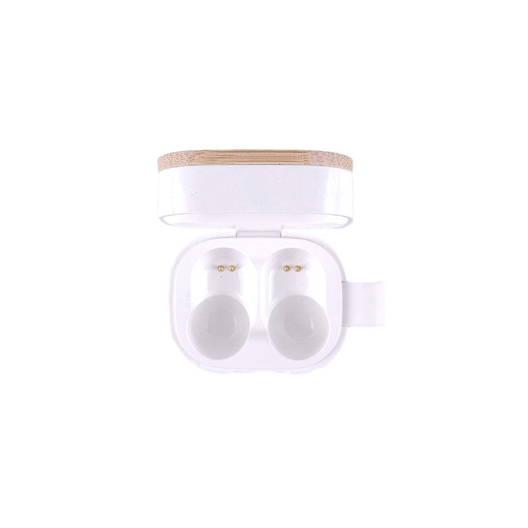 Auriculares inalámbricos fabricados en RABS, bambú y silicona. Cada auricular cuenta con un botón touch que permite contestar y finalizar llamadas, reproducir y pausar música, cambiar a la siguiente o anterior canción. Tienen tecnología Bluetooth 5.3, una duración de batería de aproximadamente 4 horas y un estuche de carga de 300 mAh, el cual se carga a través de un cable usb c. Los auriculares cuentan con almohadillas de diferentes tamaños.