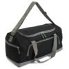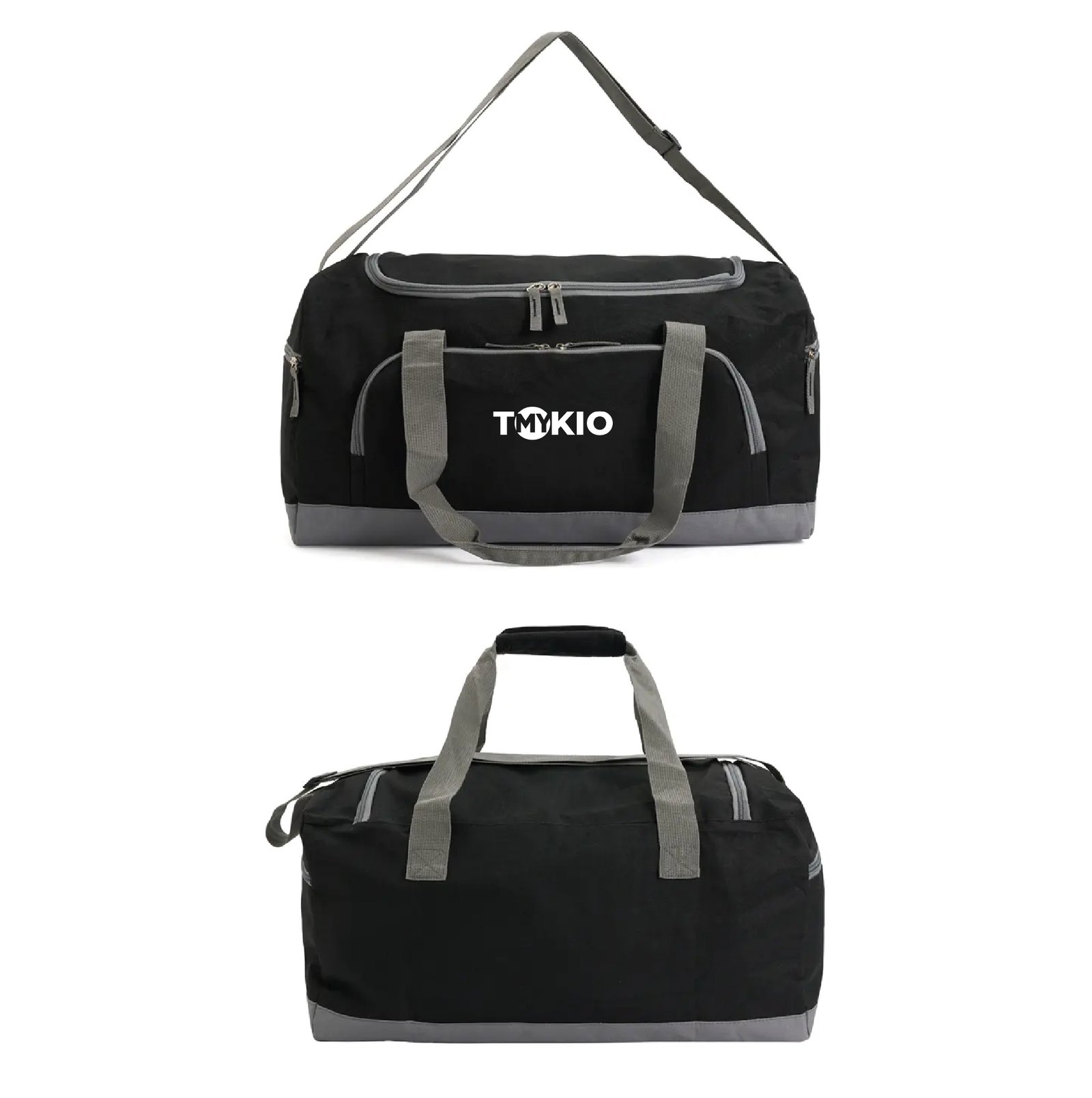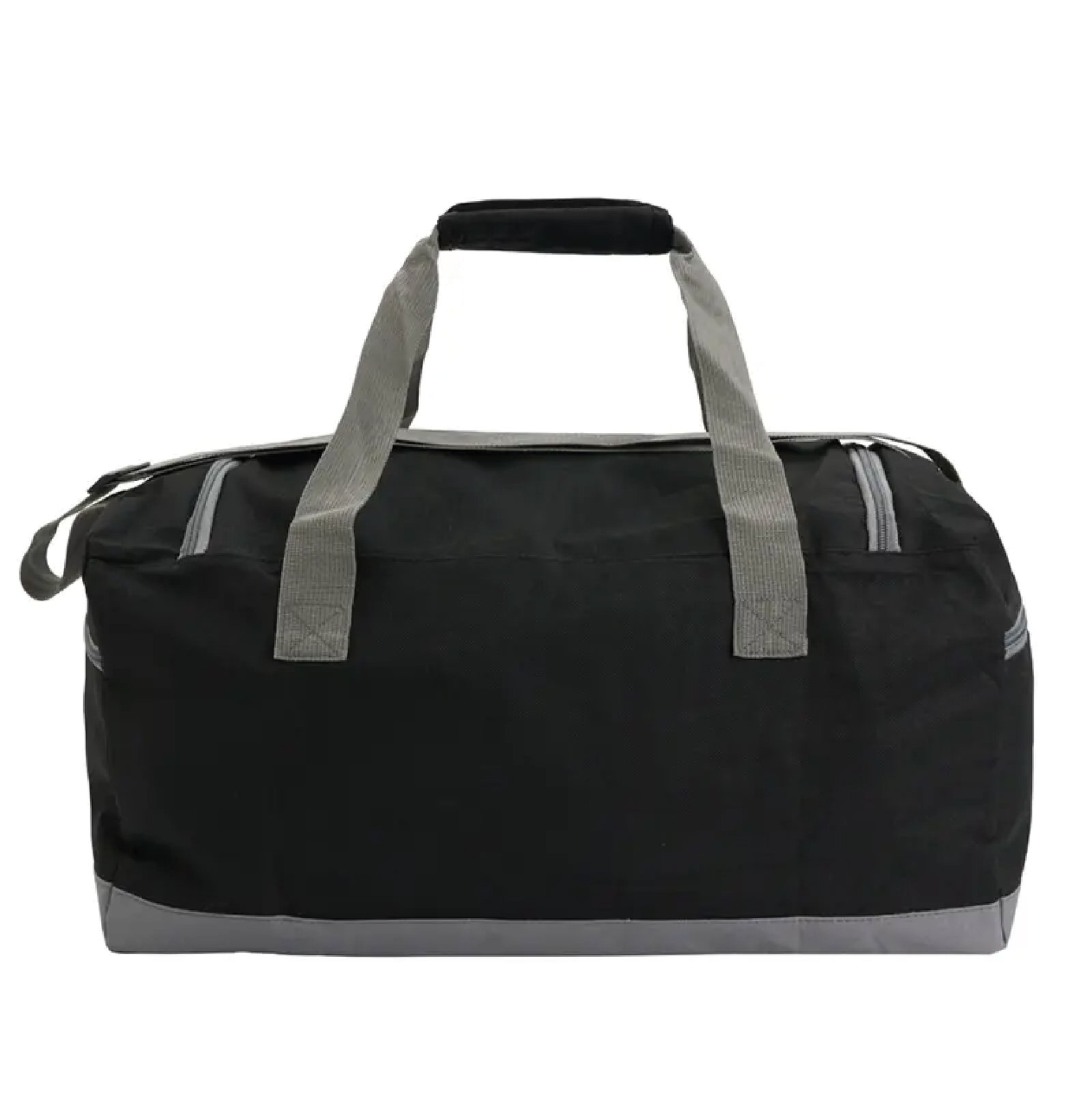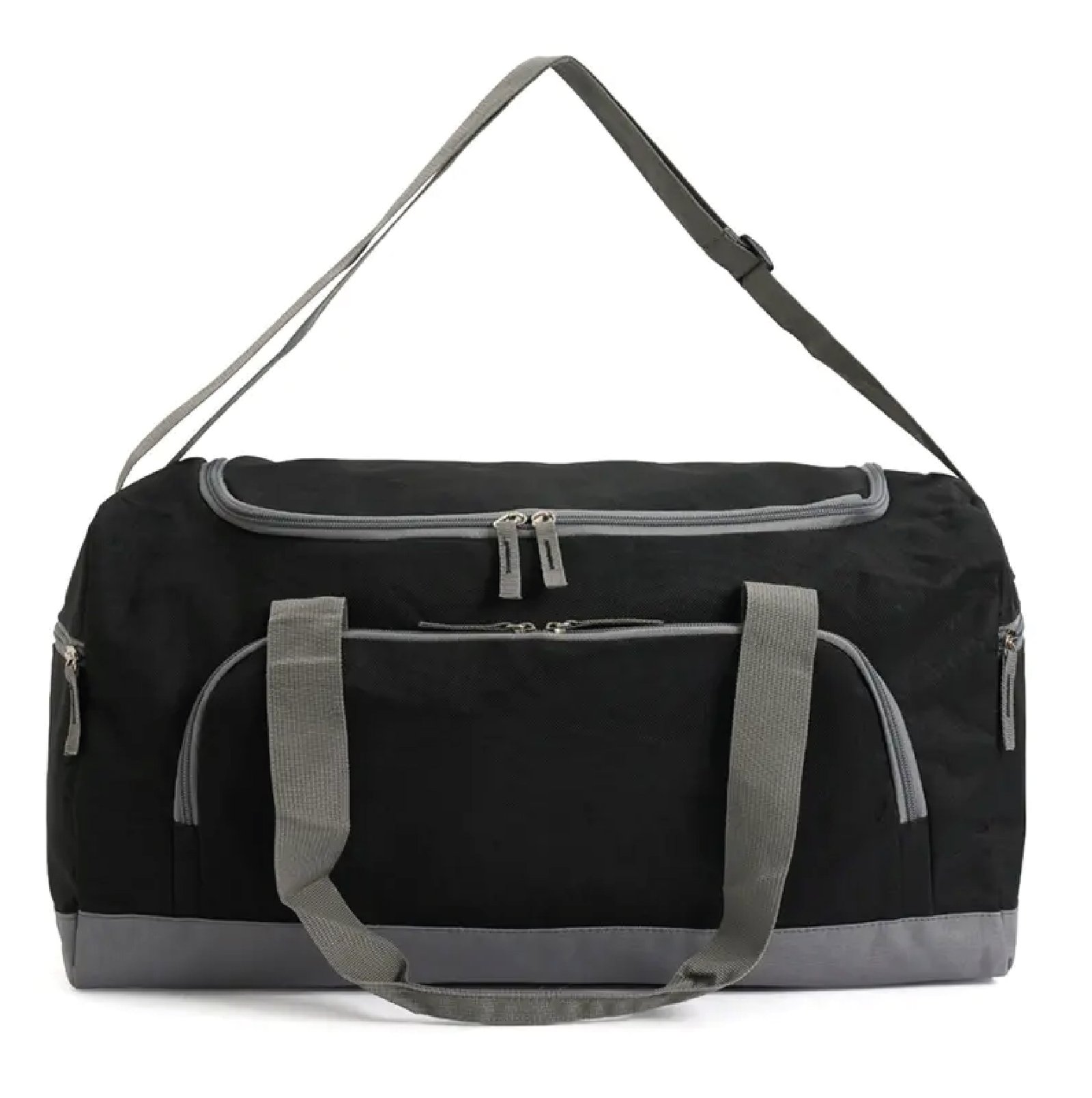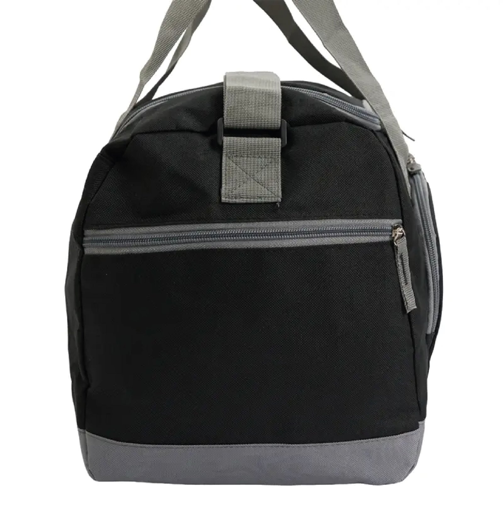 Bolso deportivo con múltiples bolsillos y tiras contrastantes. Confeccionado en tela 600D. Cuenta con compartimiento principal con cierre, bolsillos delanteros y laterales, manijas superiores y correa regulable. Es ideal para entrenamientos, actividades deportivas o escapadas cortas.