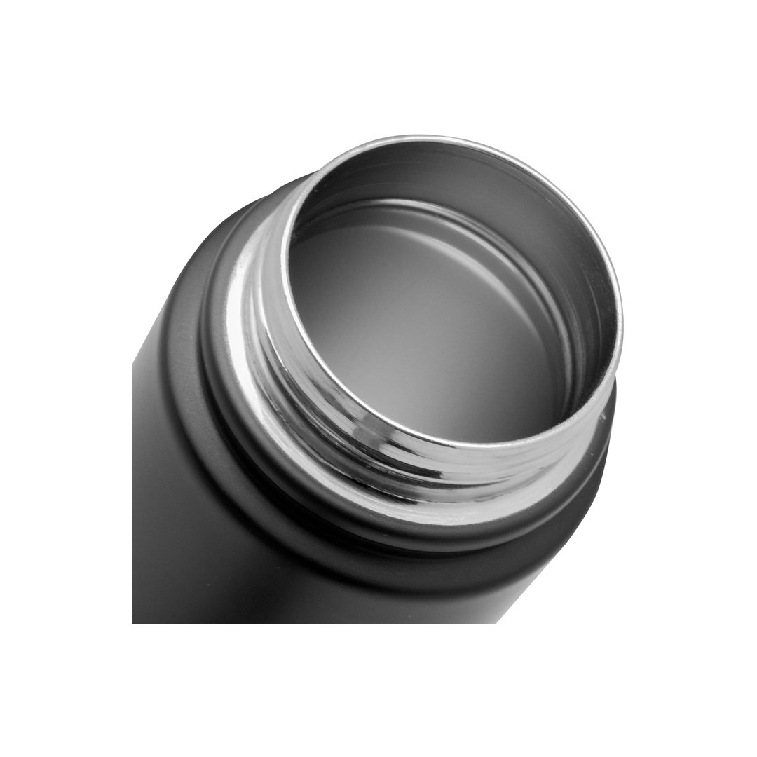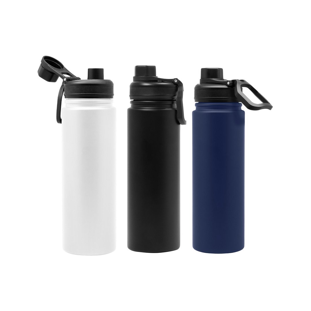 Capacidad 720 ml. Acero inoxidable. Botella doble pared, sellada al vacío. Interior en acero 304 y exterior en acero 201. Tapa con anillo de silicona, boquilla con cierre a rosca antiderrame y manija plástica para su agarre. Mantiene hasta 12 hs la temperatura de las bebidas calientes y 24 hs de las bebidas frías.