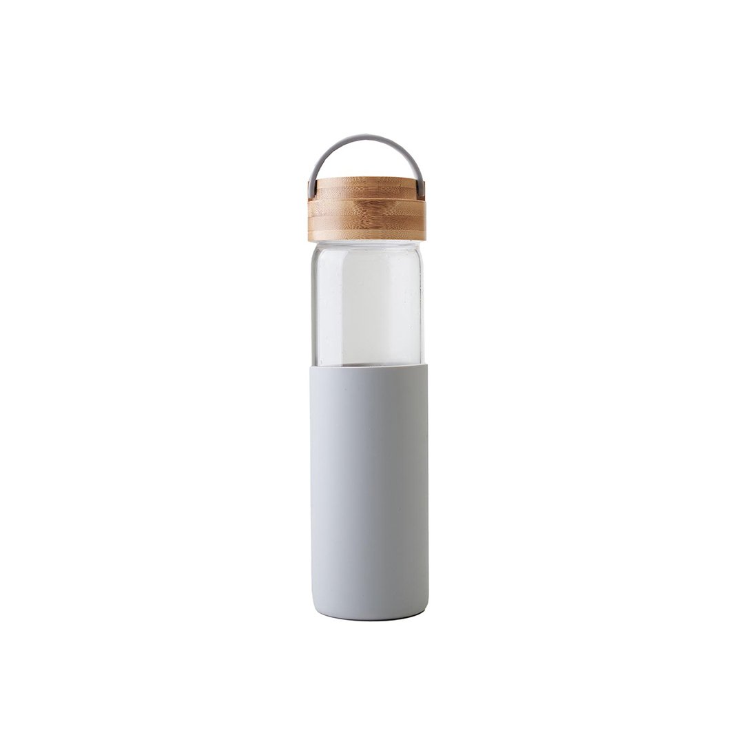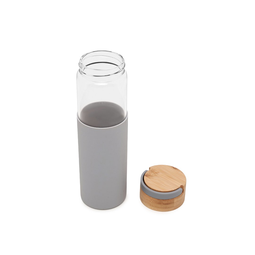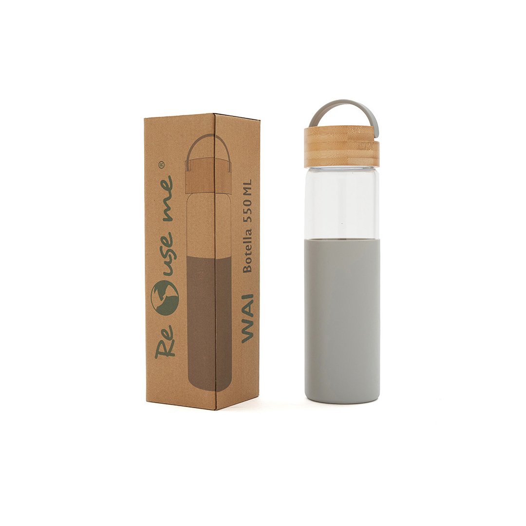 Botella reutilizable de vidrio, con tapa de bamboo y funda de silicona. Cuenta con un agarre en su tapa para su transporte. Producto libre de BPA. Producto aprobado por el I.N.A.L. para el contacto con alimentos. Medidas: 22,6 cm x 6,8 cm (Altura x Diámetro). Capacidad: 550ml.