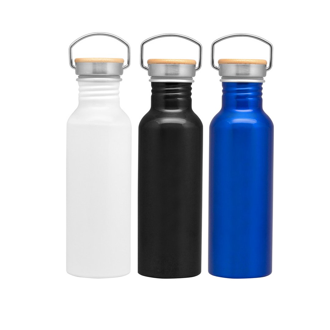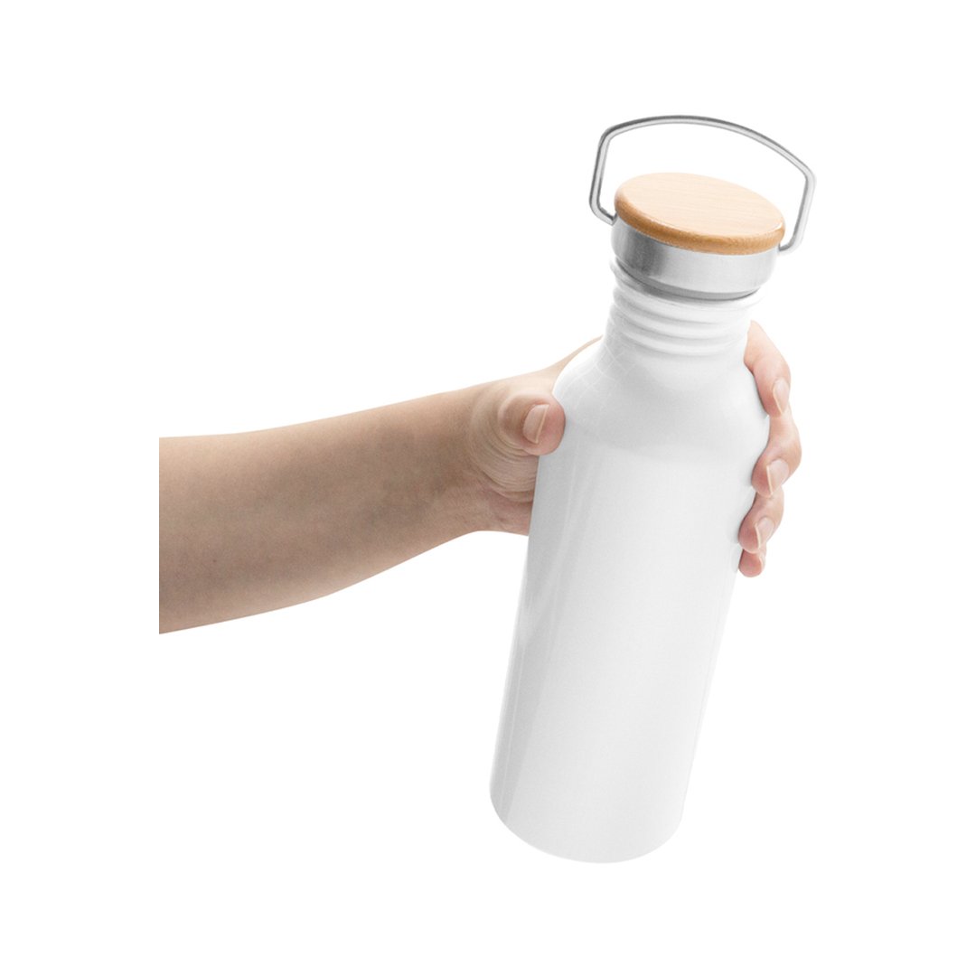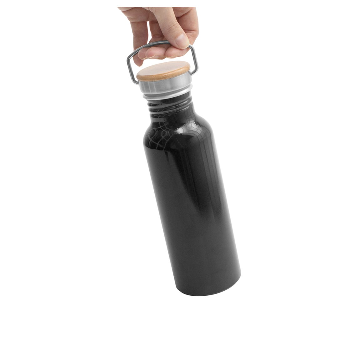 Botella con capacidad 750 ml. Aluminio. Tapa de acero con manija metálica rebatible y detalles en bambú. Anillo de silicona antiderrame.