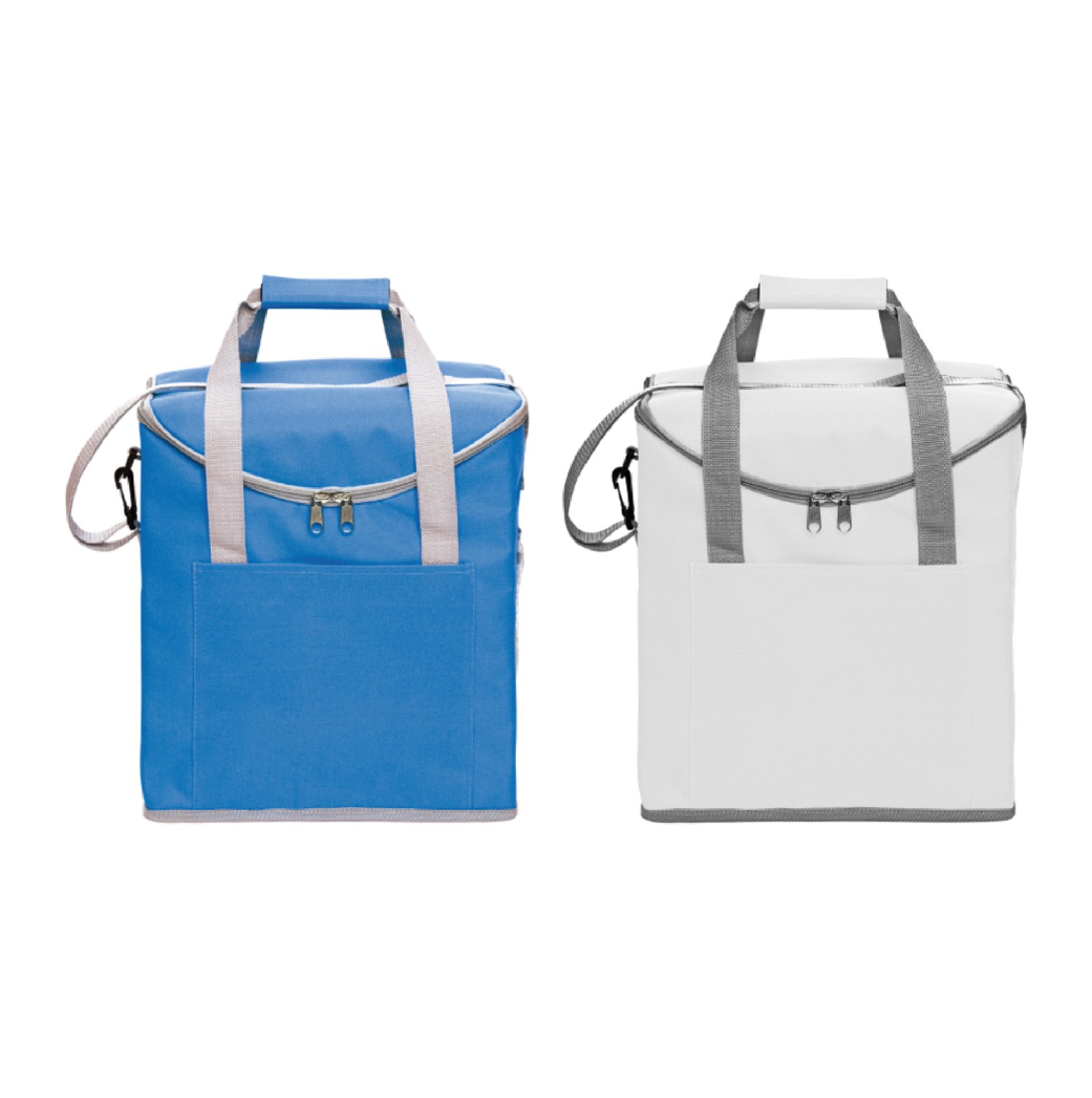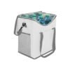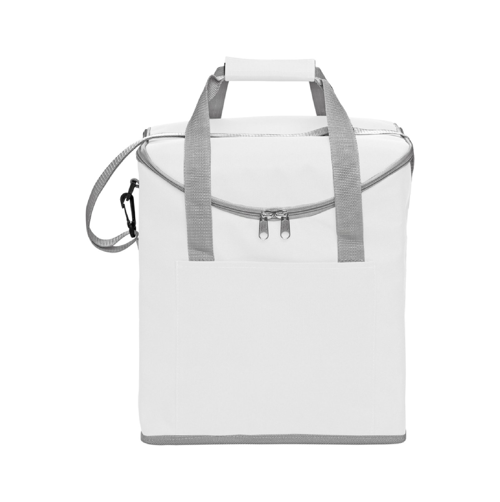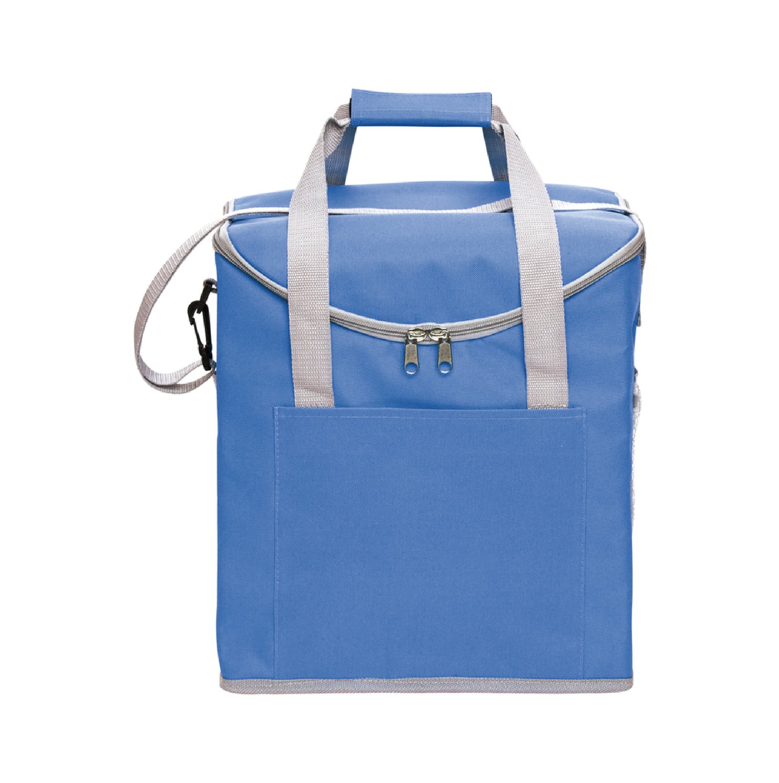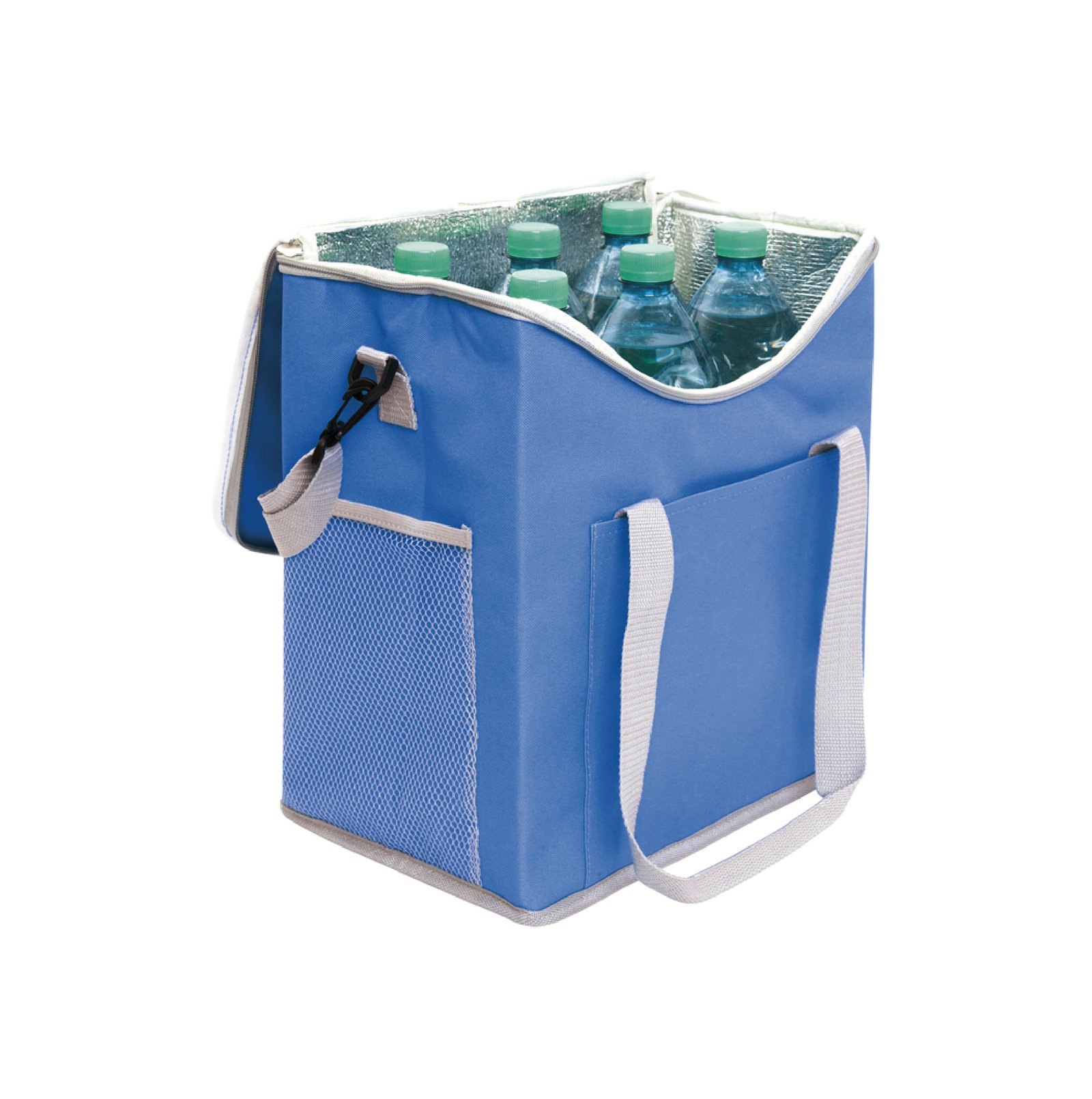 Lonchera térmica con recubrimiento interior metalizado. Un bolsillo frontal y dos bolsillos laterales de red. Correa tipo bandolera y dos manijas reforzadas con cierre de velcro. Capacidad 37 litros (hasta 6 botellas de 2,5 litros). Medidas: 30 x 34 x 19,5 cm. Poliéster. 600D