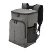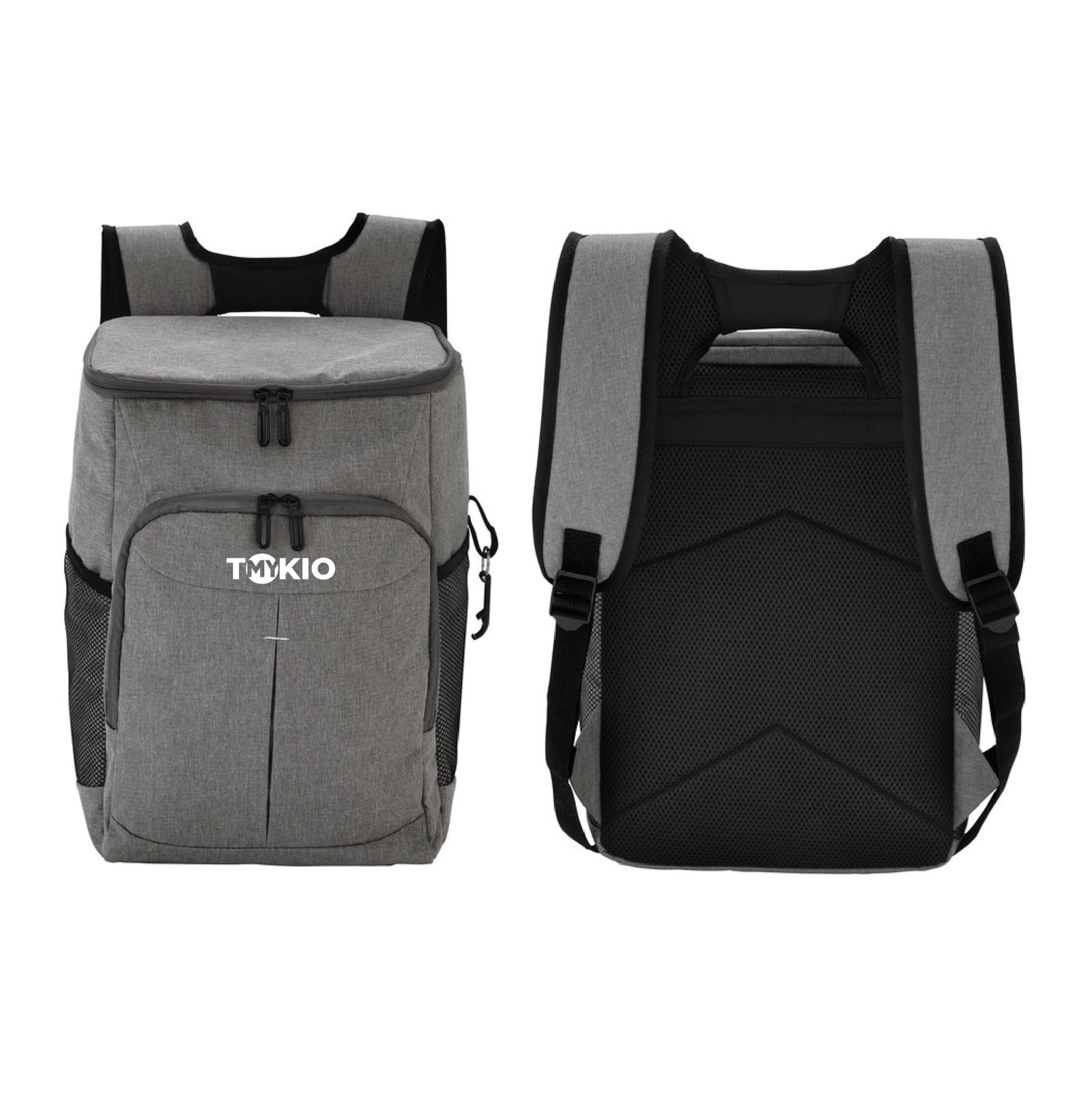 Mochila cooler. Compartimento principal con cierre en la parte superior. Compartimento frontal con cierre. Dos bolsillos laterales de red multipropósito. Incluye llavero destapador de botellas de aluminio (5,5 x 1,1 cm) extraíble. Correas regulables acolchadas y reforzadas. Cierres metálicos. Tiradores de cierre metálicos de color negro. ||