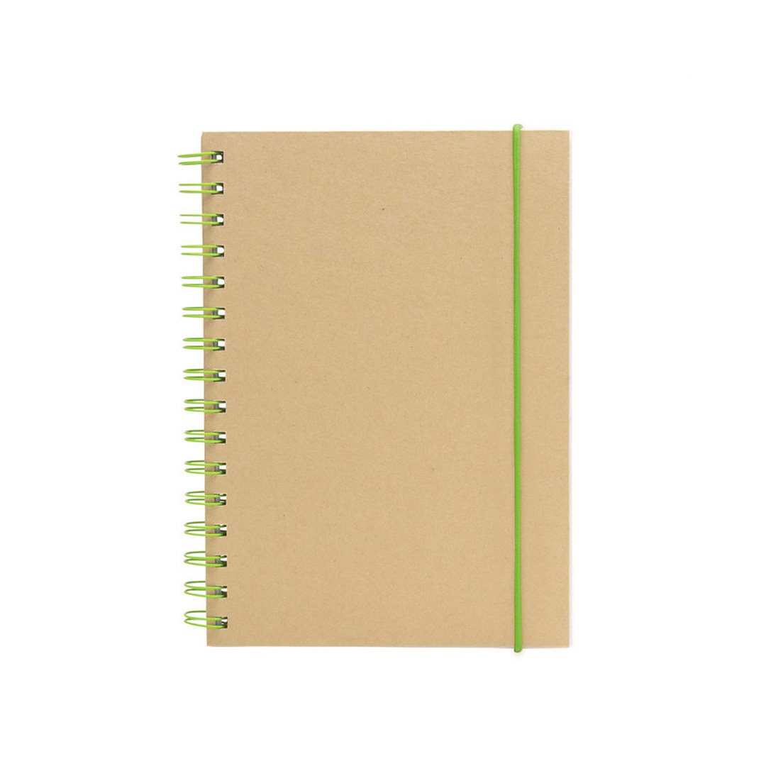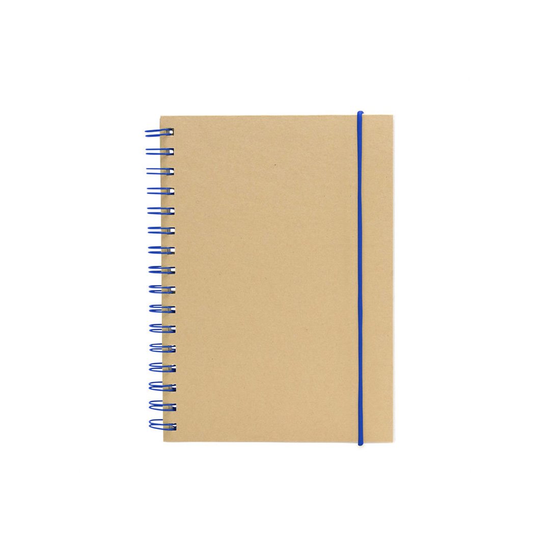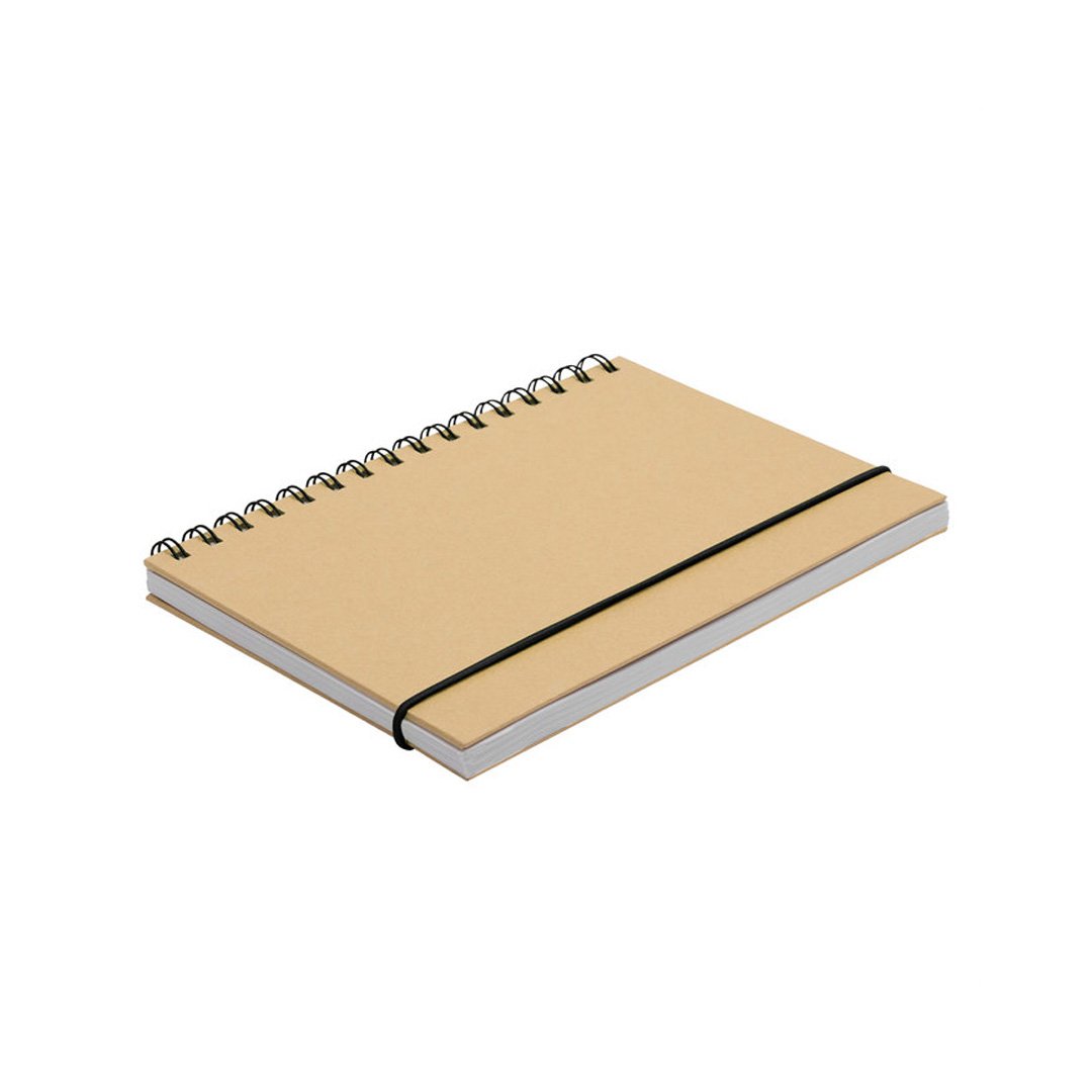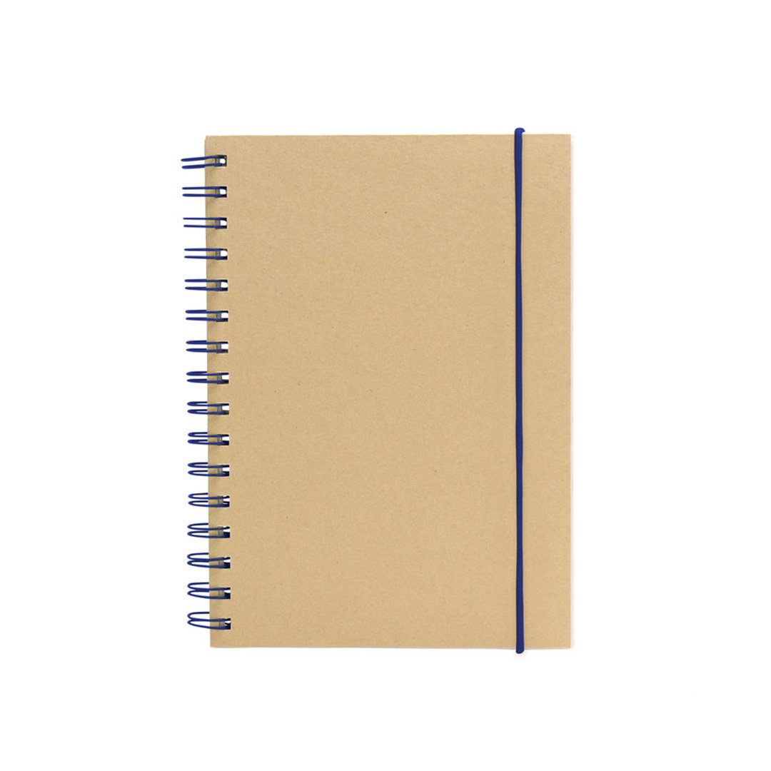 Libreta espiralada. Tapa recubierta en papel kraft de 120 g. Interior de 70 hojas blancas rayadas de 80 g. Cierre con banda elástica y espiral del mismo color.