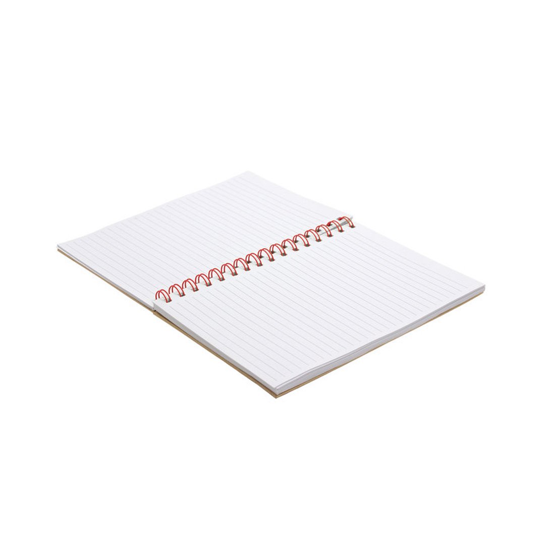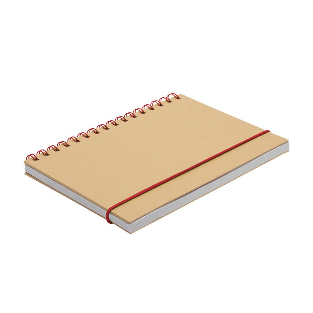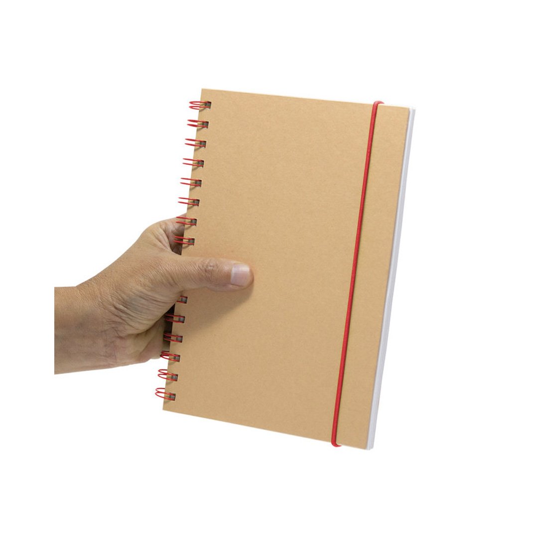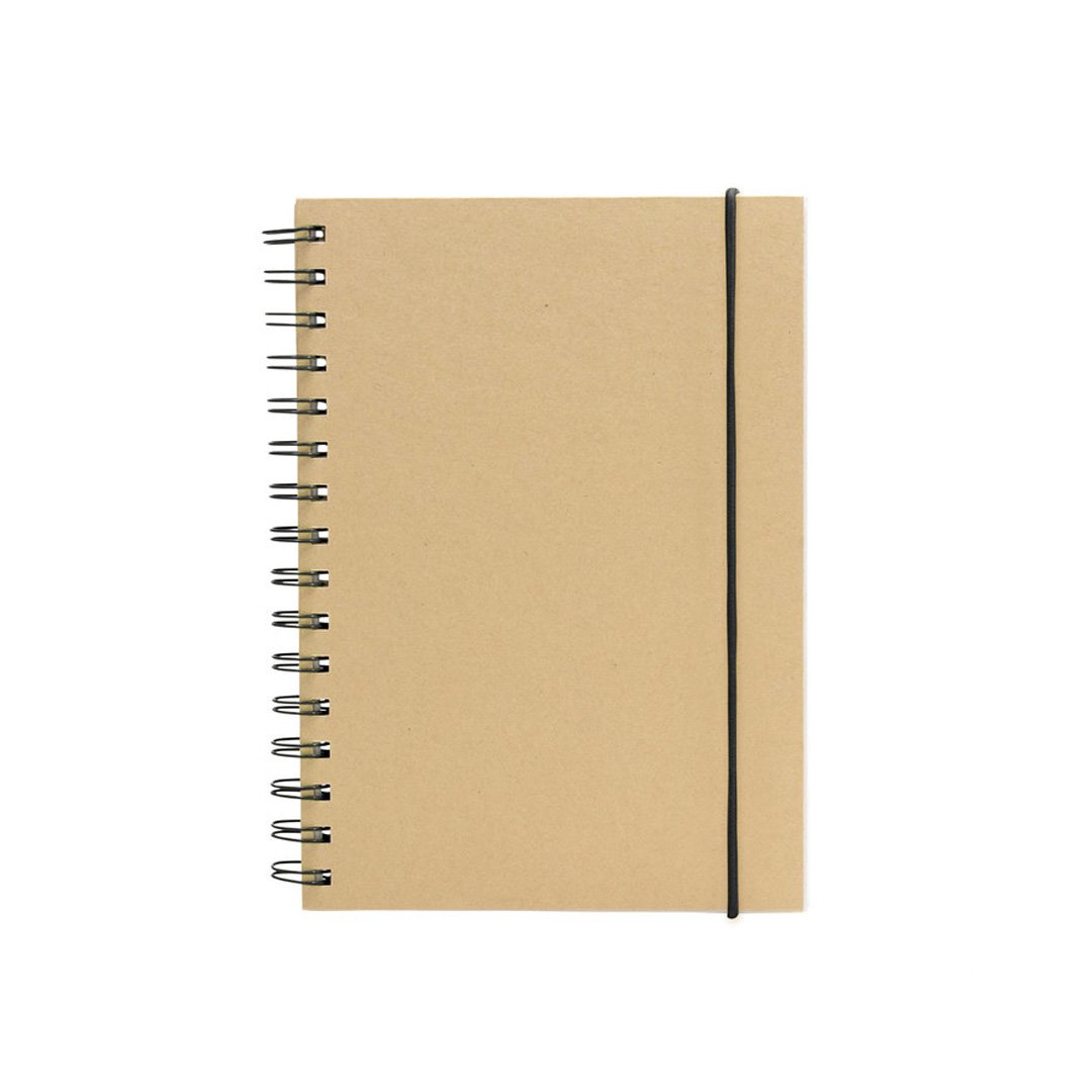 Libreta espiralada. Tapa recubierta en papel kraft de 120 g. Interior de 70 hojas blancas rayadas de 80 g. Cierre con banda elástica y espiral del mismo color.