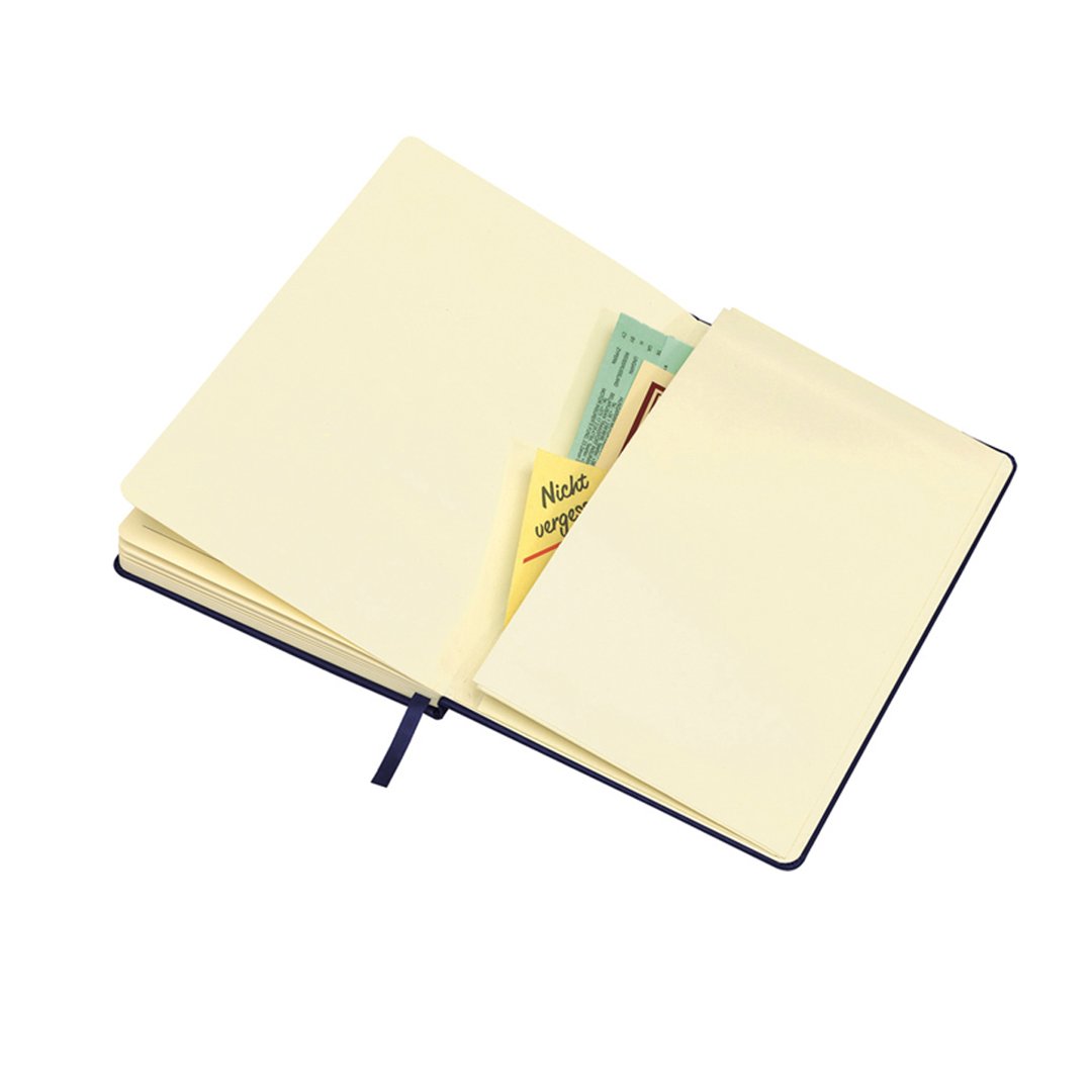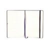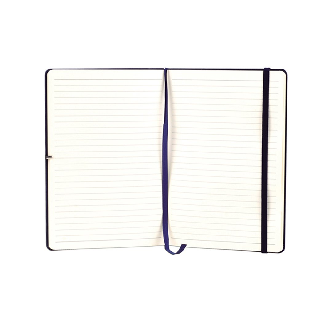 Cuaderno de cartón. 14 x 1,5 x 21 cm. 80 páginas rayadas. Separador de hojas en tela. Cierre con banda elástica. Bolsillo interior en la parte trasera de la libreta.