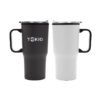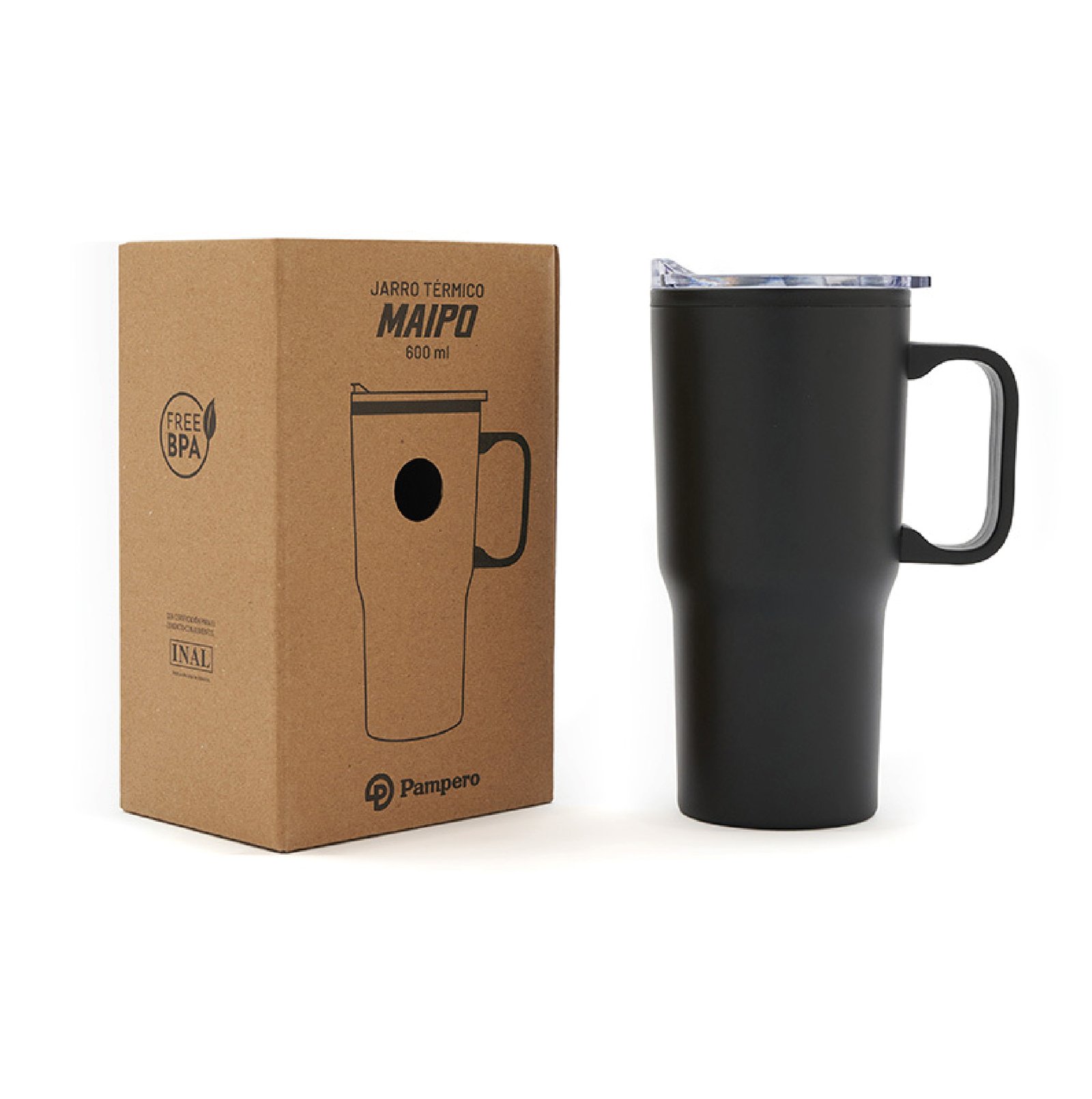 Jarro térmico con mango, realizado en acero inoxidable en su exterior, y polipropileno de color negro en su interior. Cuenta con tapa transparente cristal clear con cierre. Incluye base antideslizante. Capacidad: 600 ml.
