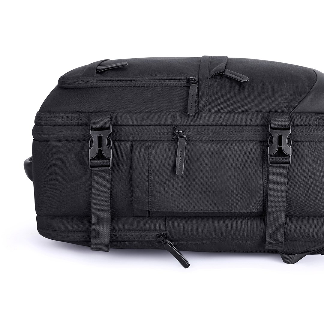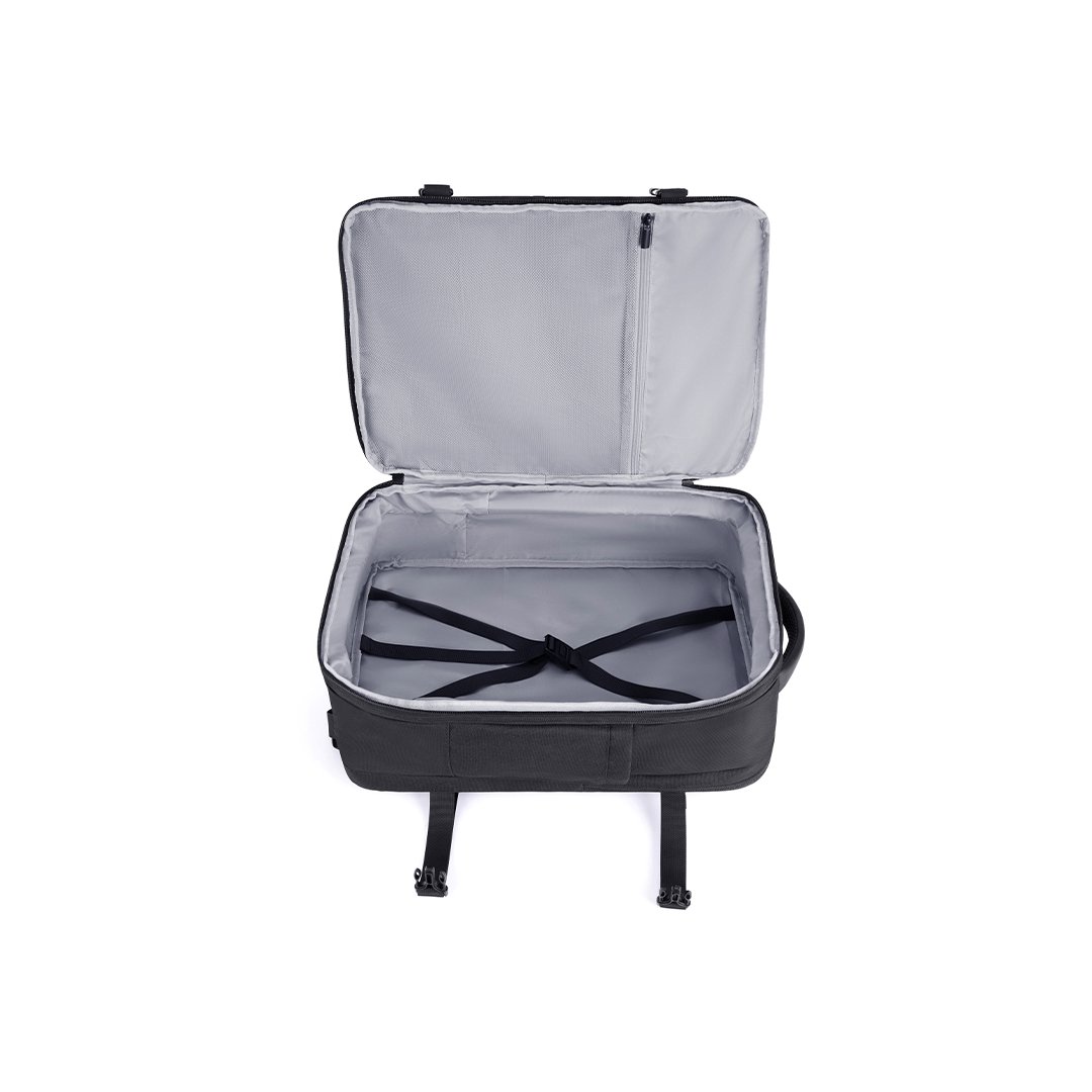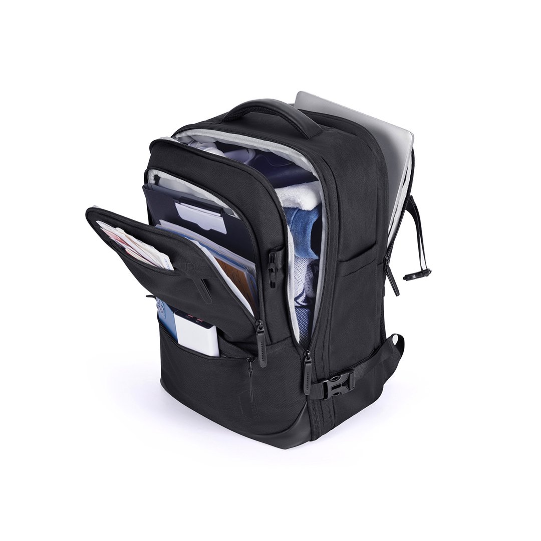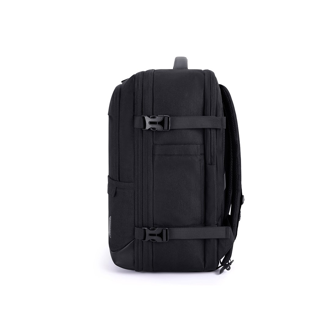 Mochila ideal para viajes, con capacidad de hasta 40L, expandible 5cm de alto (de 25 a 40 litros). Cabe en el compartimiento superior del avión y debajo del asiento delantero. Cuenta con 2 bolsas para guardar ropa y 1 bolsa para zapatos. Prácticos bolsillos exteriores, compartimiento frontal y porta notebook de hasta 17,3″. Cómoda correa trasera para enganchar la valija y hebilla ajustable en el pecho. Fabricada en poliéster resistente al agua.
