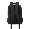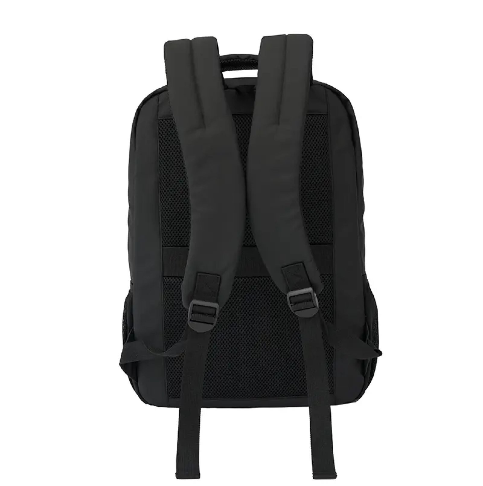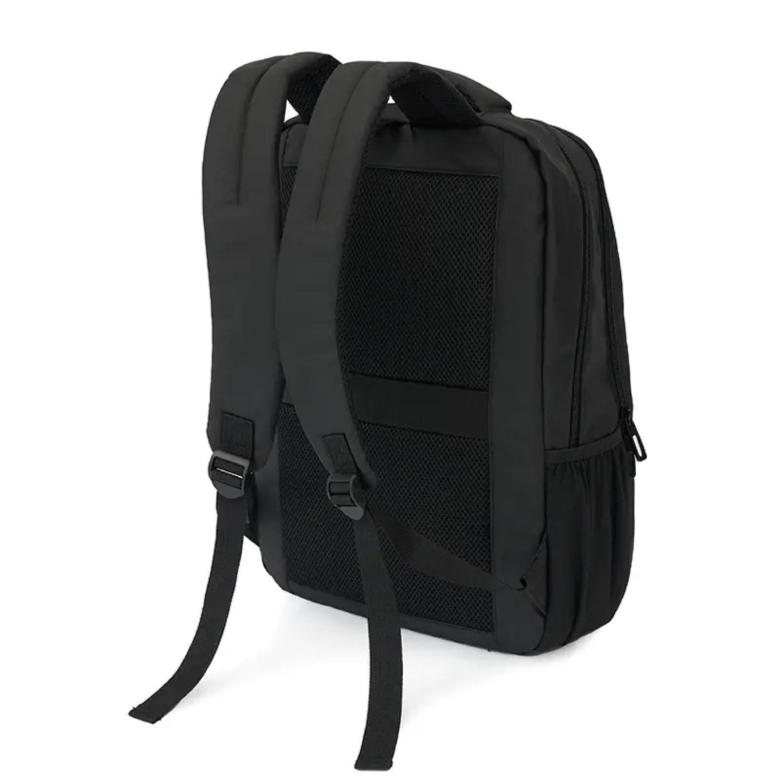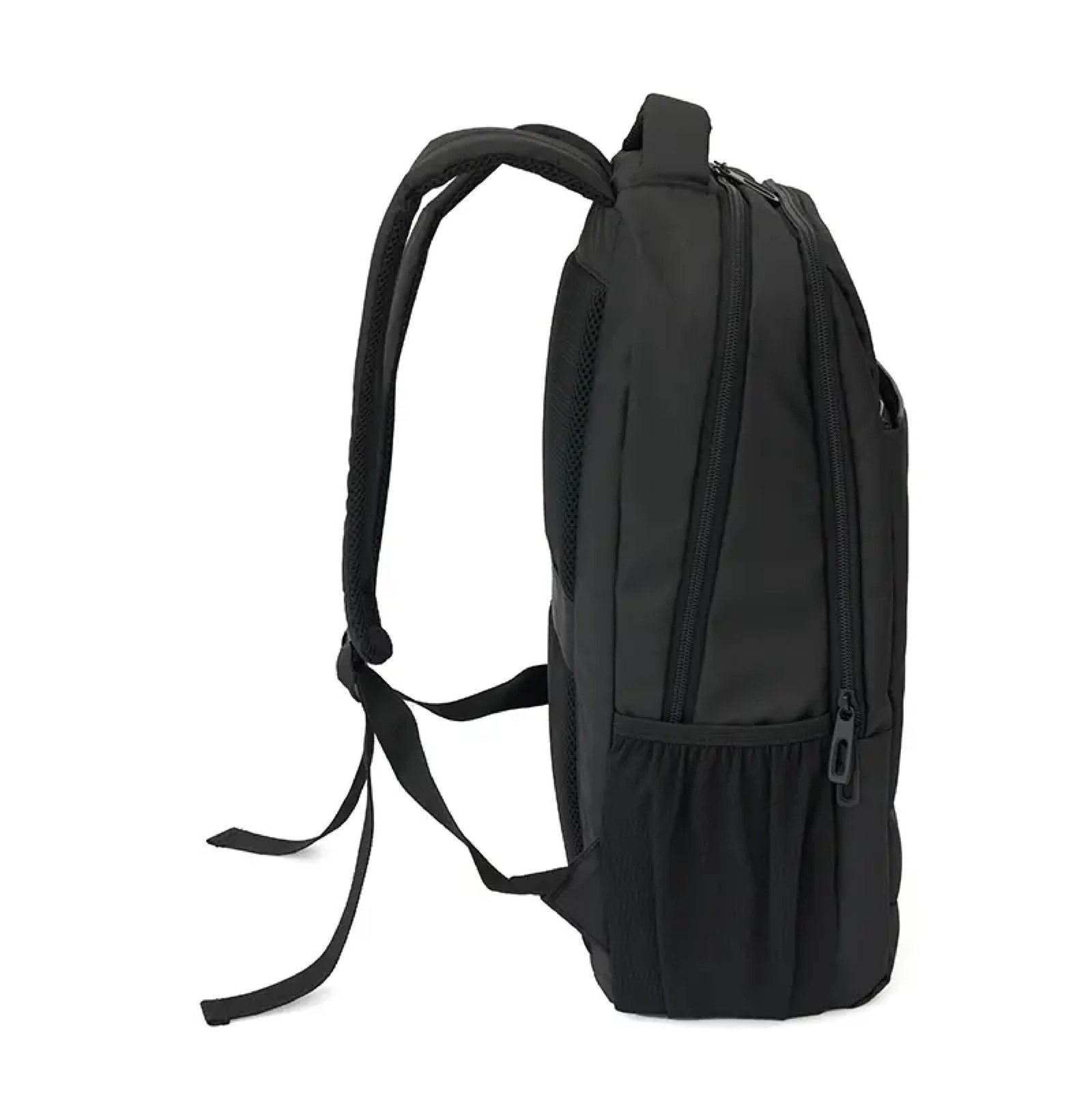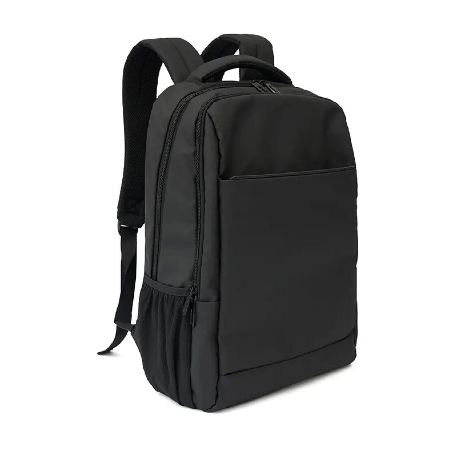 Mochila de color negro, fabricada con material PU en el exterior y espuma PE con forro completo. Dispone de un compartimento para computadora con correa elástica y velcro y otro amplio compartimento, un bolsillo frontal, dos bolsillos laterales de malla con elástico. Acomoda notebooks de hasta 15,6″. Además, cuenta con respaldo y correas acolchadas para mayor comodidad. Ideal para quienes necesitan una mochila funcional y organizada para el trabajo o estudios, con espacio suficiente para llevar una notebook y otros artículos esenciales. | Medidas: 44 x 30 x 11 cm.