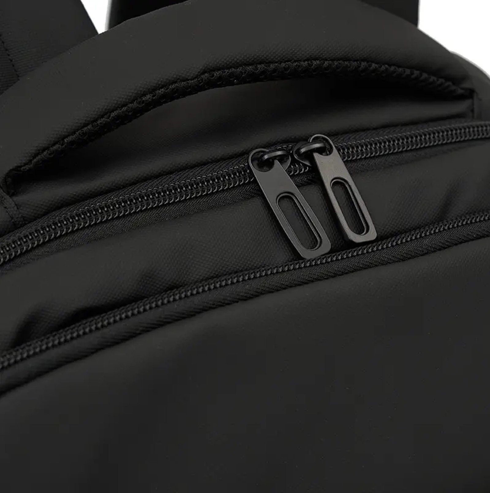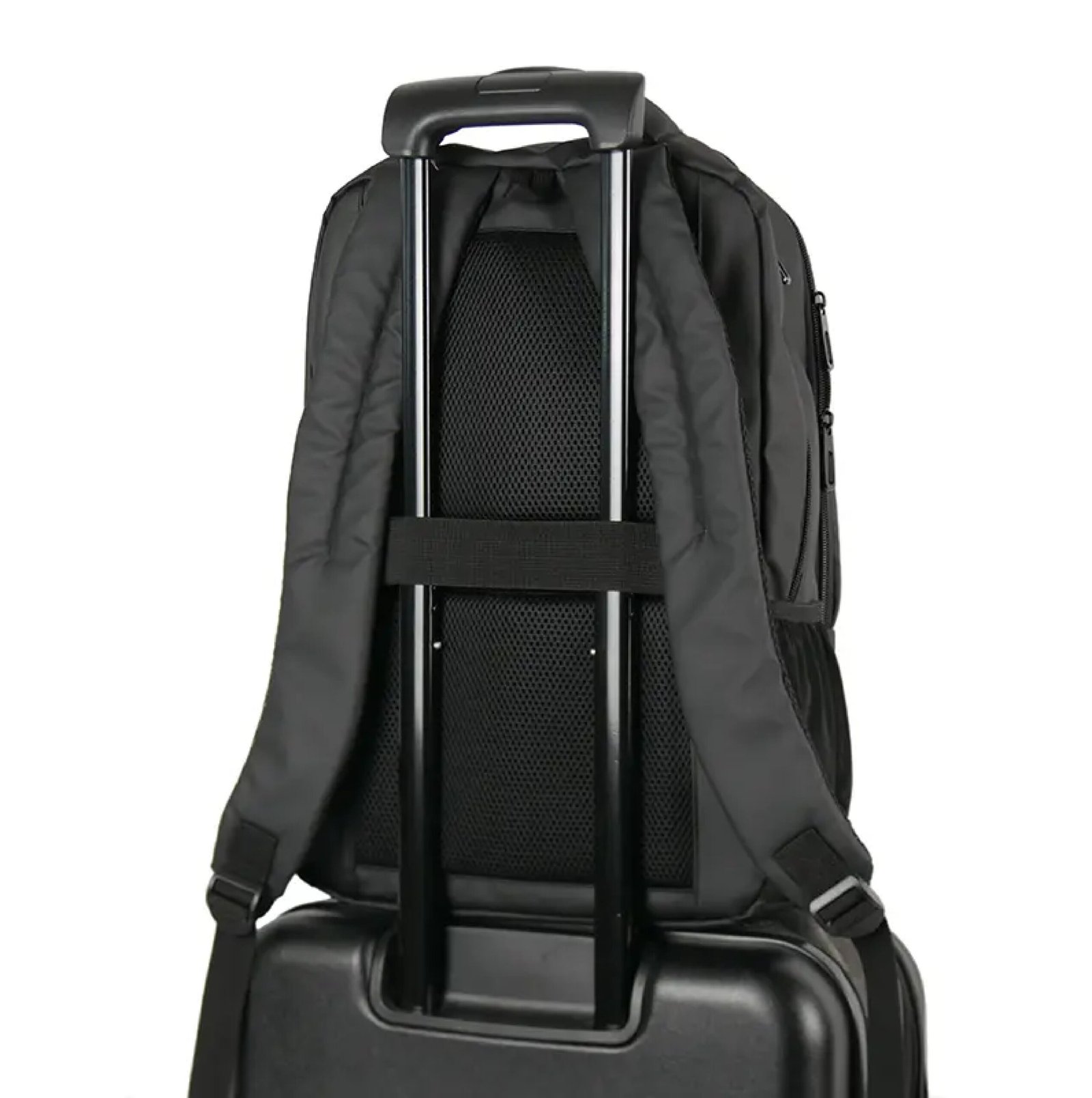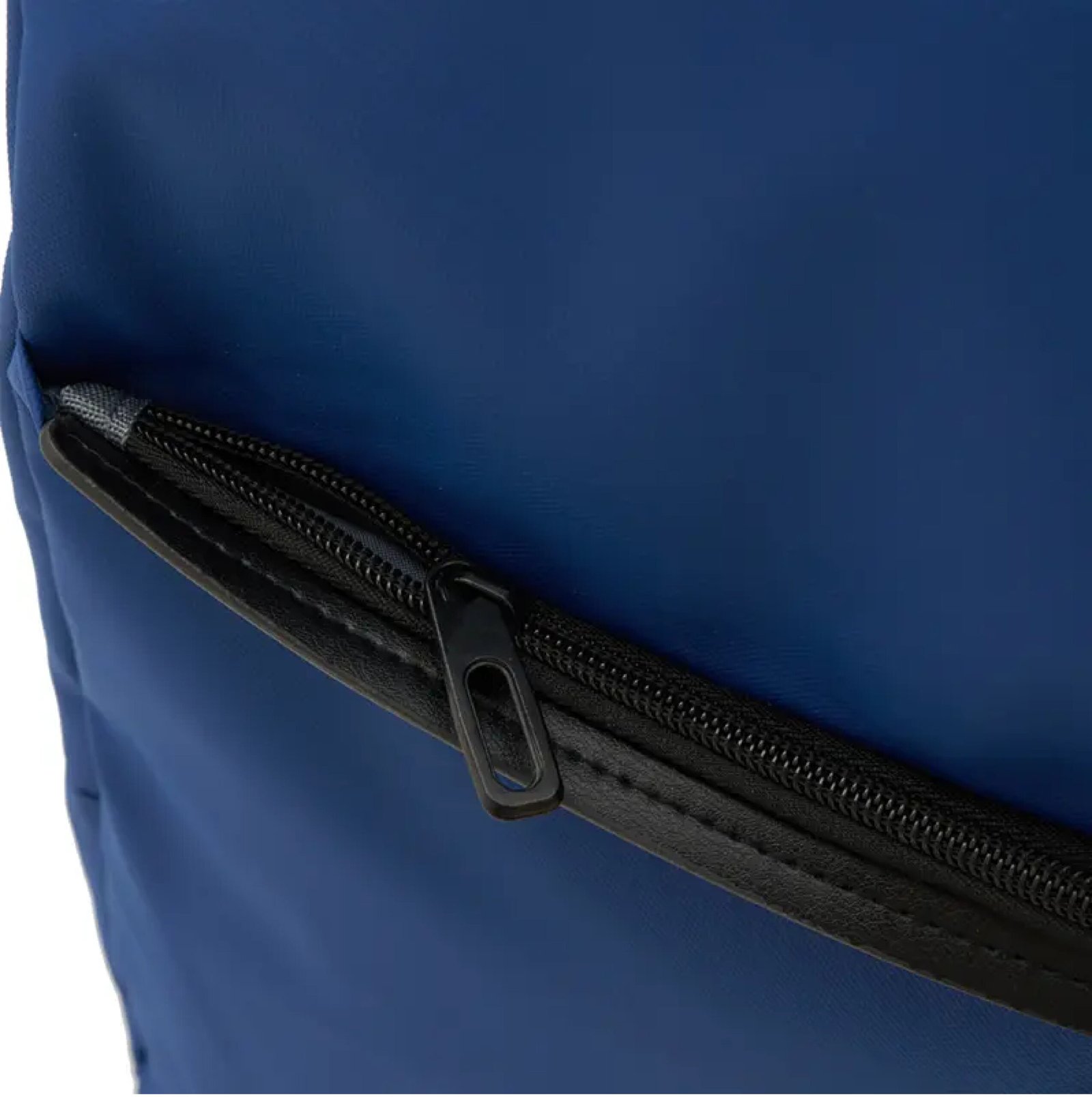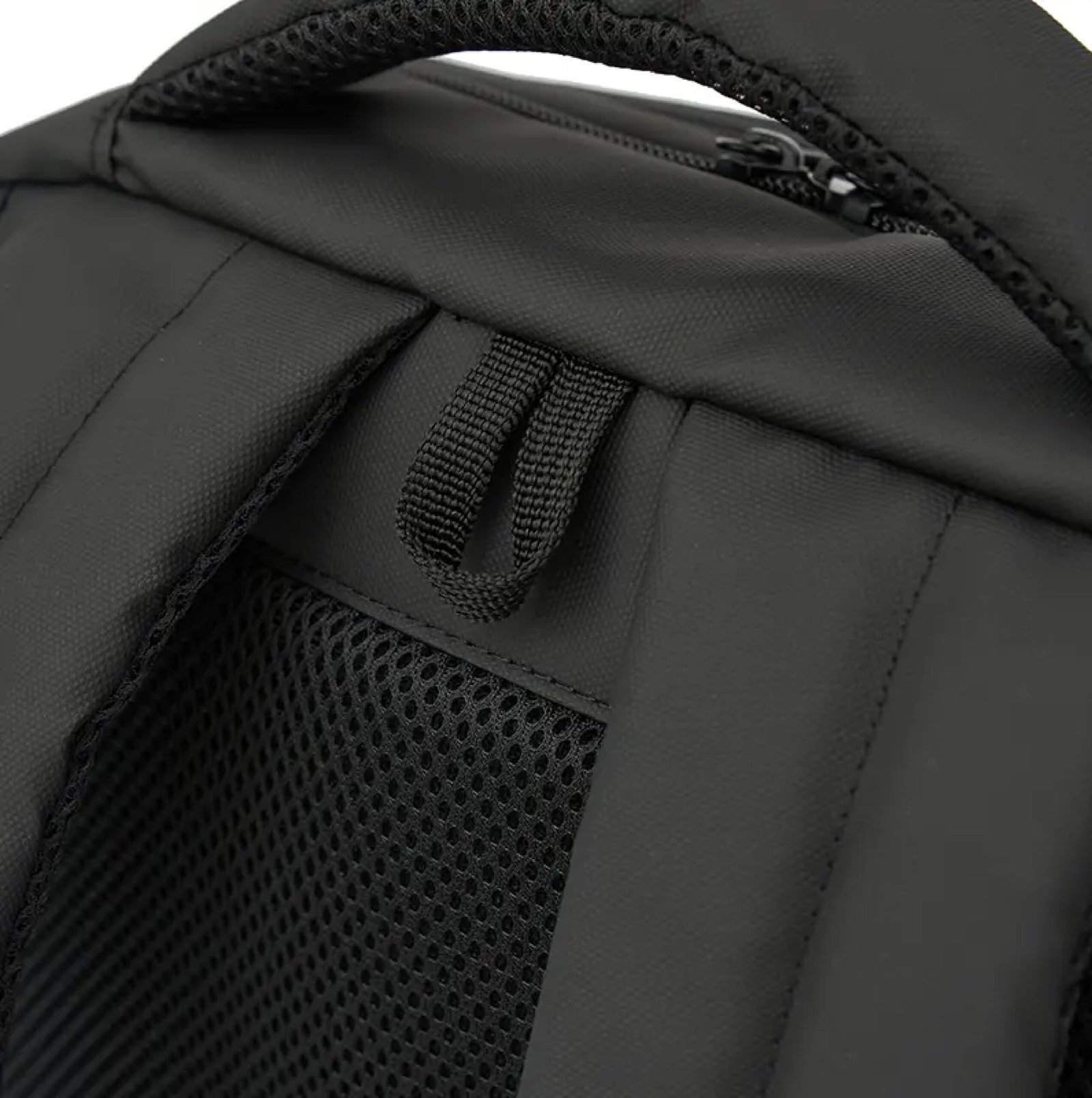 Mochila de color negro, fabricada con material PU en el exterior y espuma PE con forro completo. Dispone de un compartimento para computadora con correa elástica y velcro y otro amplio compartimento, un bolsillo frontal, dos bolsillos laterales de malla con elástico. Acomoda notebooks de hasta 15,6″. Además, cuenta con respaldo y correas acolchadas para mayor comodidad. Ideal para quienes necesitan una mochila funcional y organizada para el trabajo o estudios, con espacio suficiente para llevar una notebook y otros artículos esenciales. | Medidas: 44 x 30 x 11 cm.