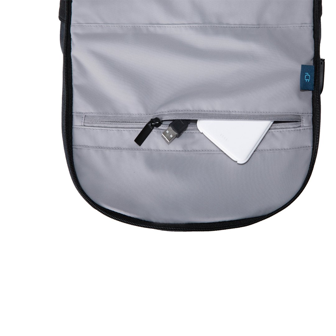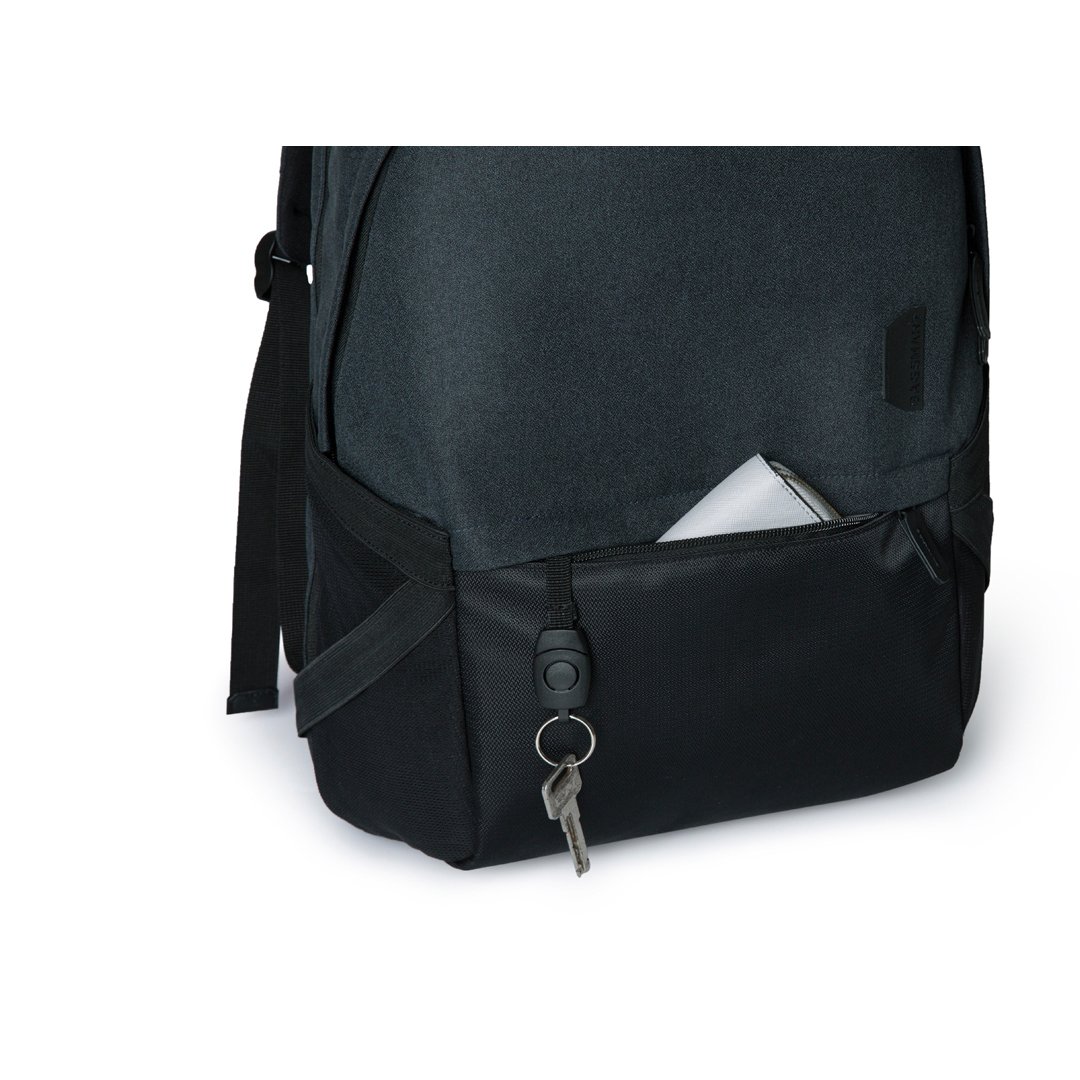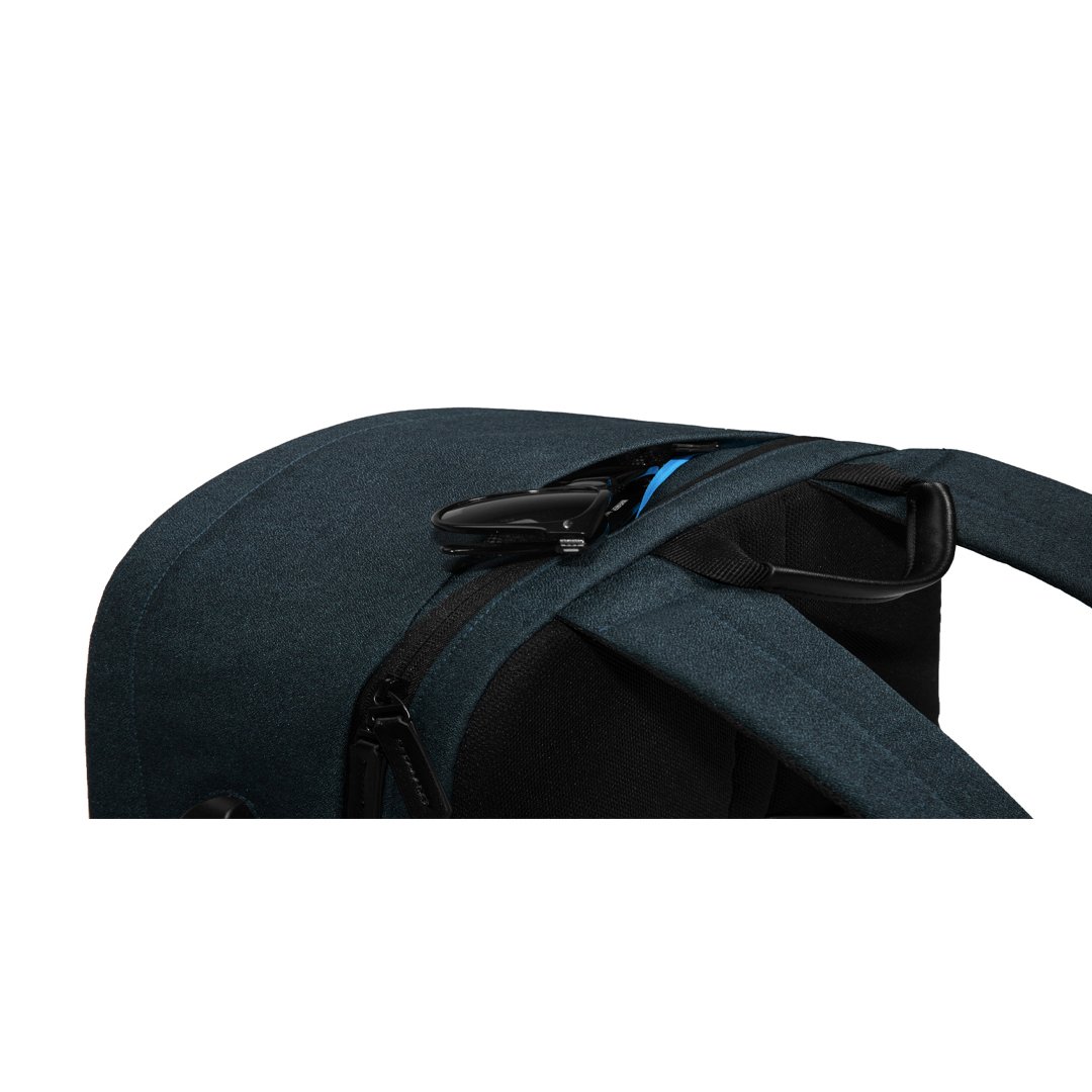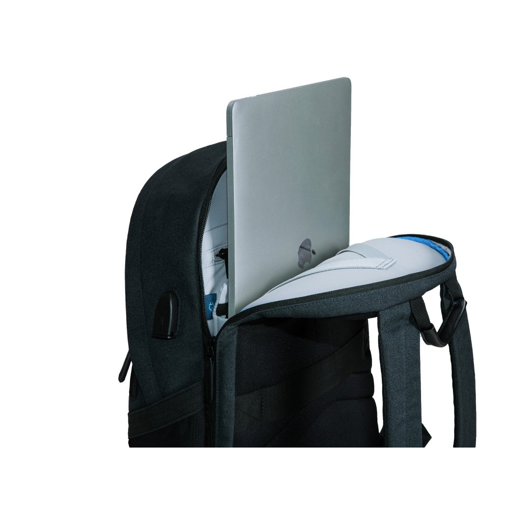 Mochila de políester 300D resistente al agua. + RPET (material reciclable), combina el color nego y azul oscuro. Múltiples compartimentos, incluye espacio porta notebook hasta 15.6″ Compartimiento especial RFID, impide que ciertas ondas electromagnéticas puedan penetrar en las tarjetas de crédito/débito que guardamos dentro dentro del mismo. Correa trasera para enganchar a la valija. E-zone es un compartimiento especialmente diseñado para proteger la notebook y accesorios digitales, cuenta con espuma EVA que protege en caso de caída. Capacidad 20L