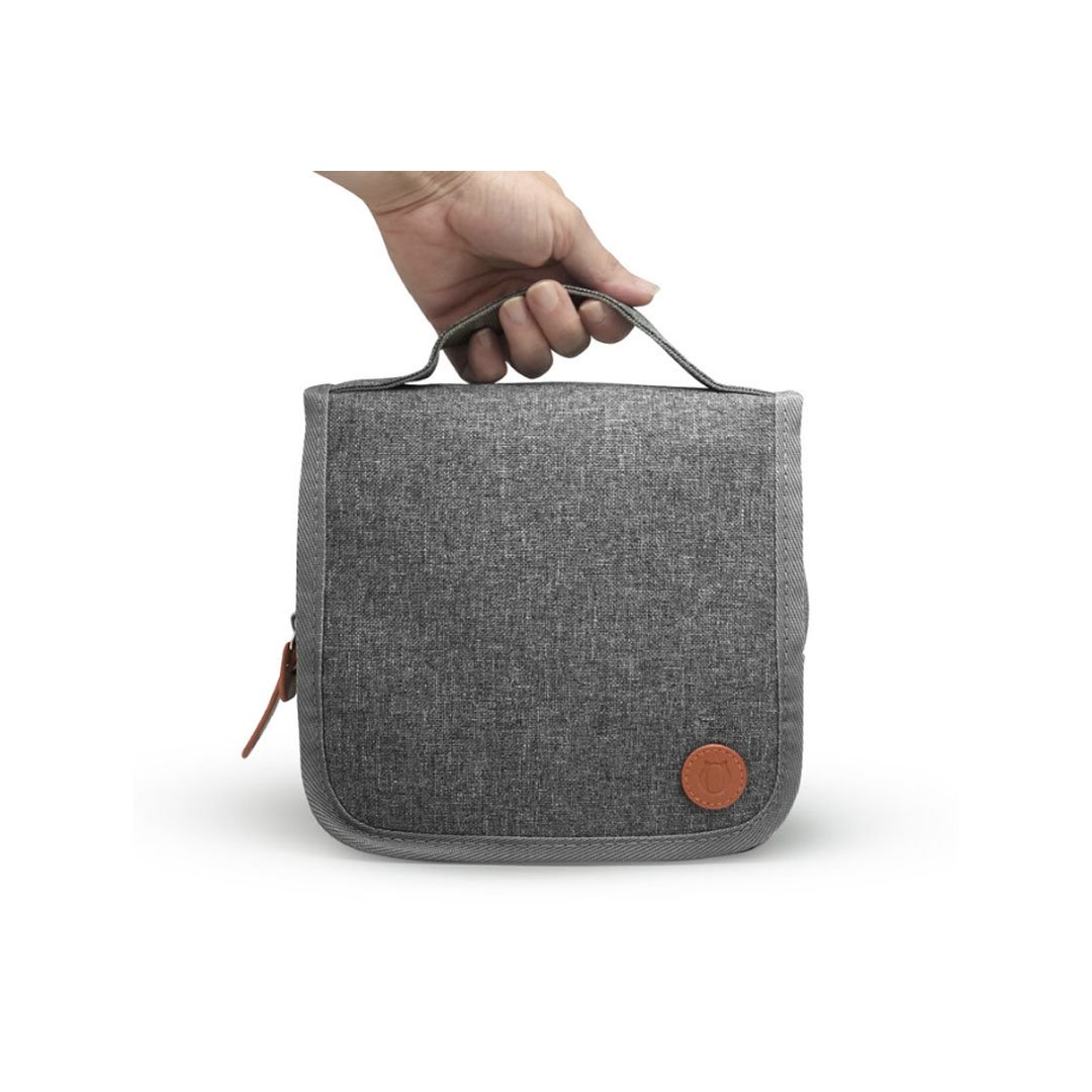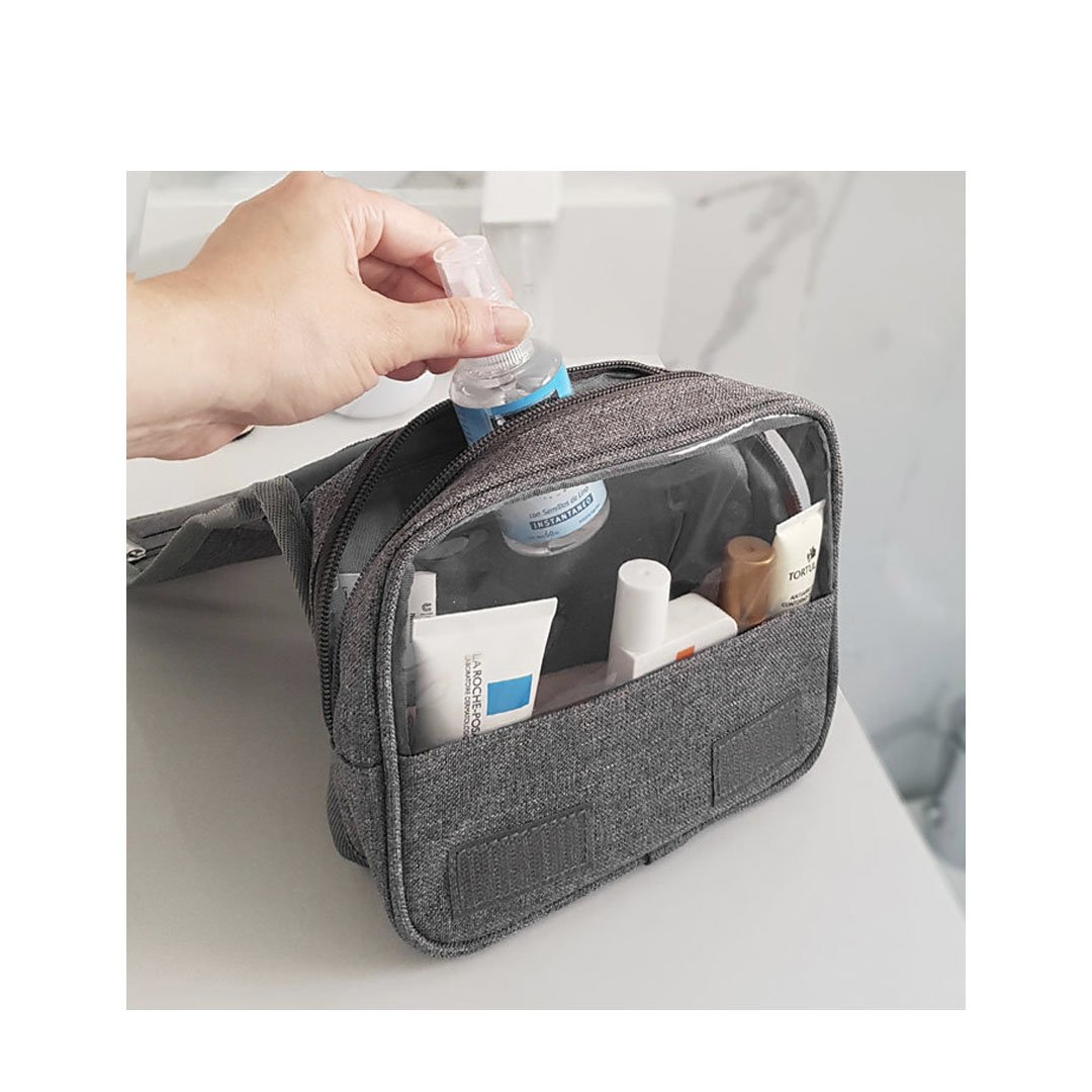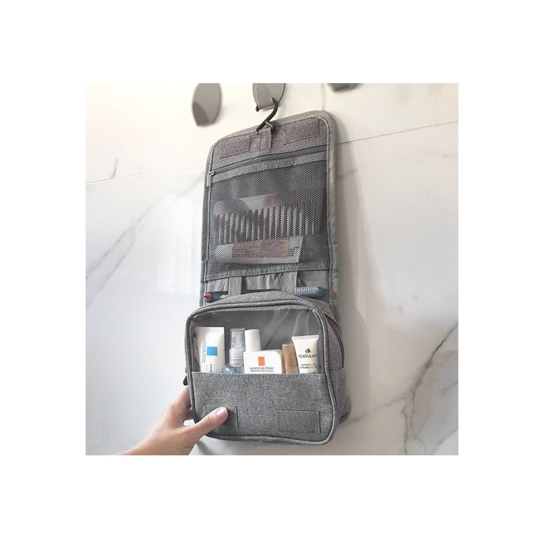 Neceser colgante. Estuche multiuso de tela con sistema de colgado, compartimentos individuales con cierre en su interior, bolsillo externo y correa de agarre.