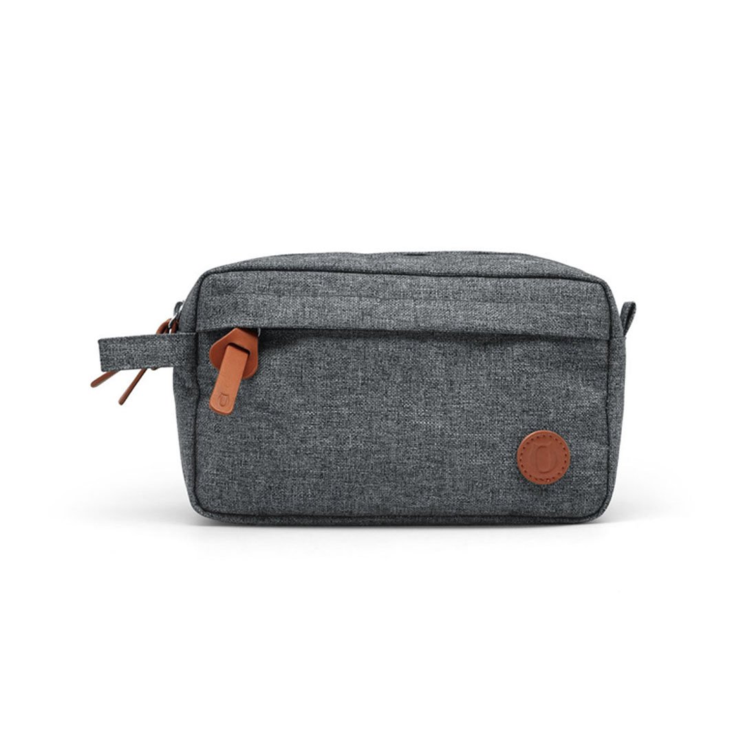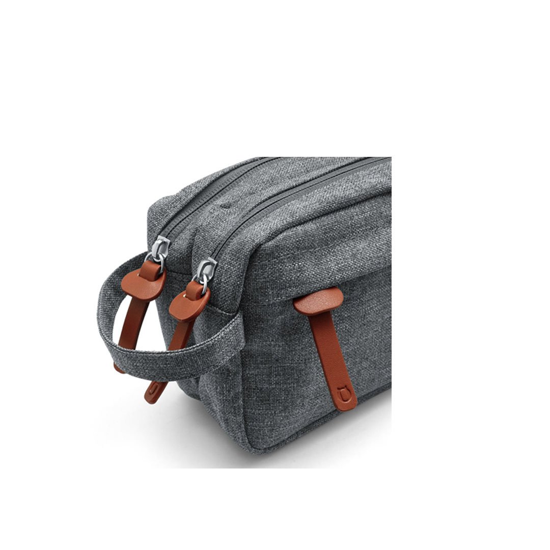 Organizador con dos compartimentos individuales forrados en el interior, un bolsillo delantero y correa para transportar. Poliéster, Nylon y Cuero ecológico. 21,5 x 13,1 x 8 cm.