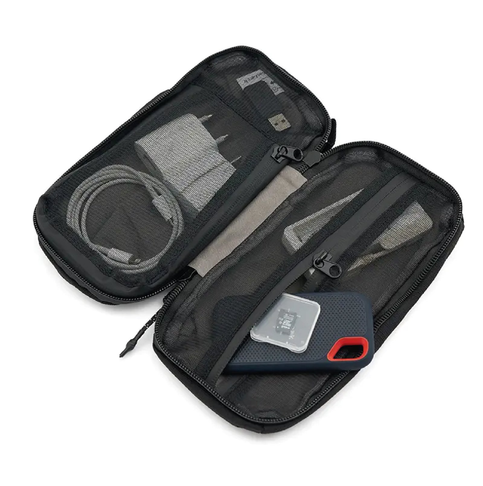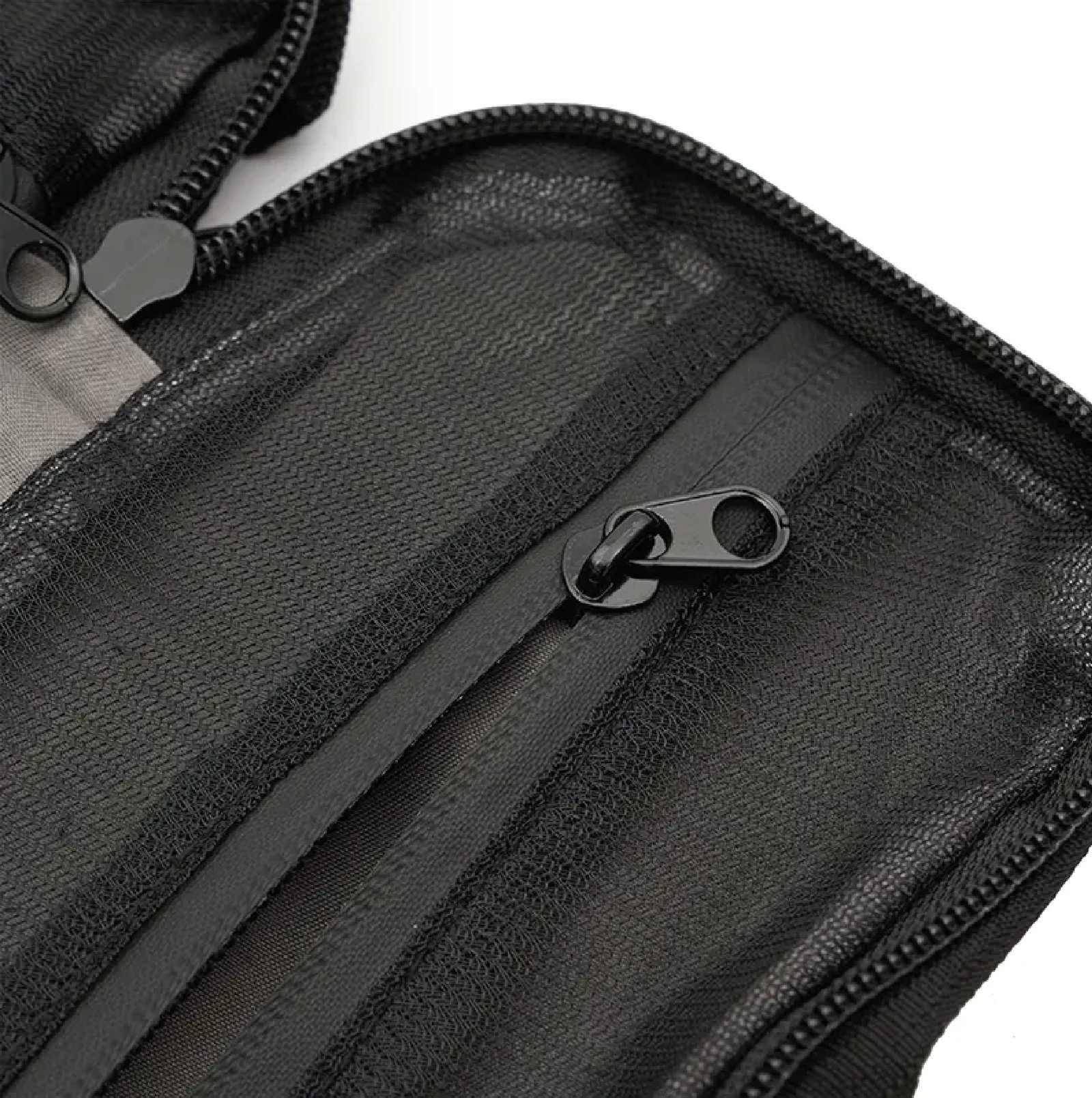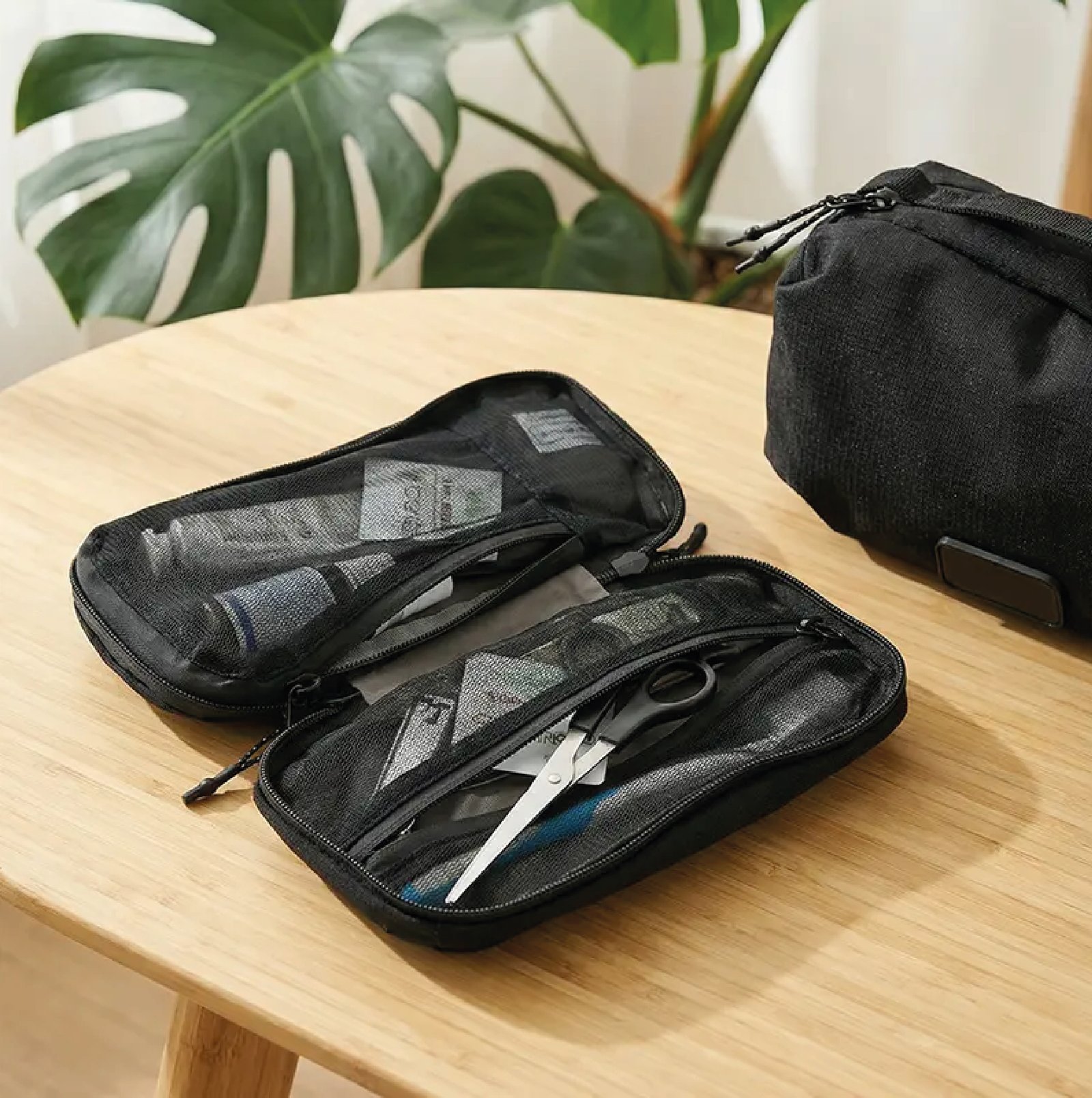 Neceser organizador de plástico reciclado oceánico. Fabricado con OceanGuard™, un tejido resistente, repelente al agua, elaborado con plástico oceánico reciclado certificado por OceanCycle. Cuenta con dos bolsillos internos de malla con cierre, asa superior y diseño plano que permite guardarlo fácilmente. Es ideal para organizar tecnología, cosméticos, herramientas u objetos esenciales del día a día en viajes, traslados o uso diario. | Capacidad: 2 litros.