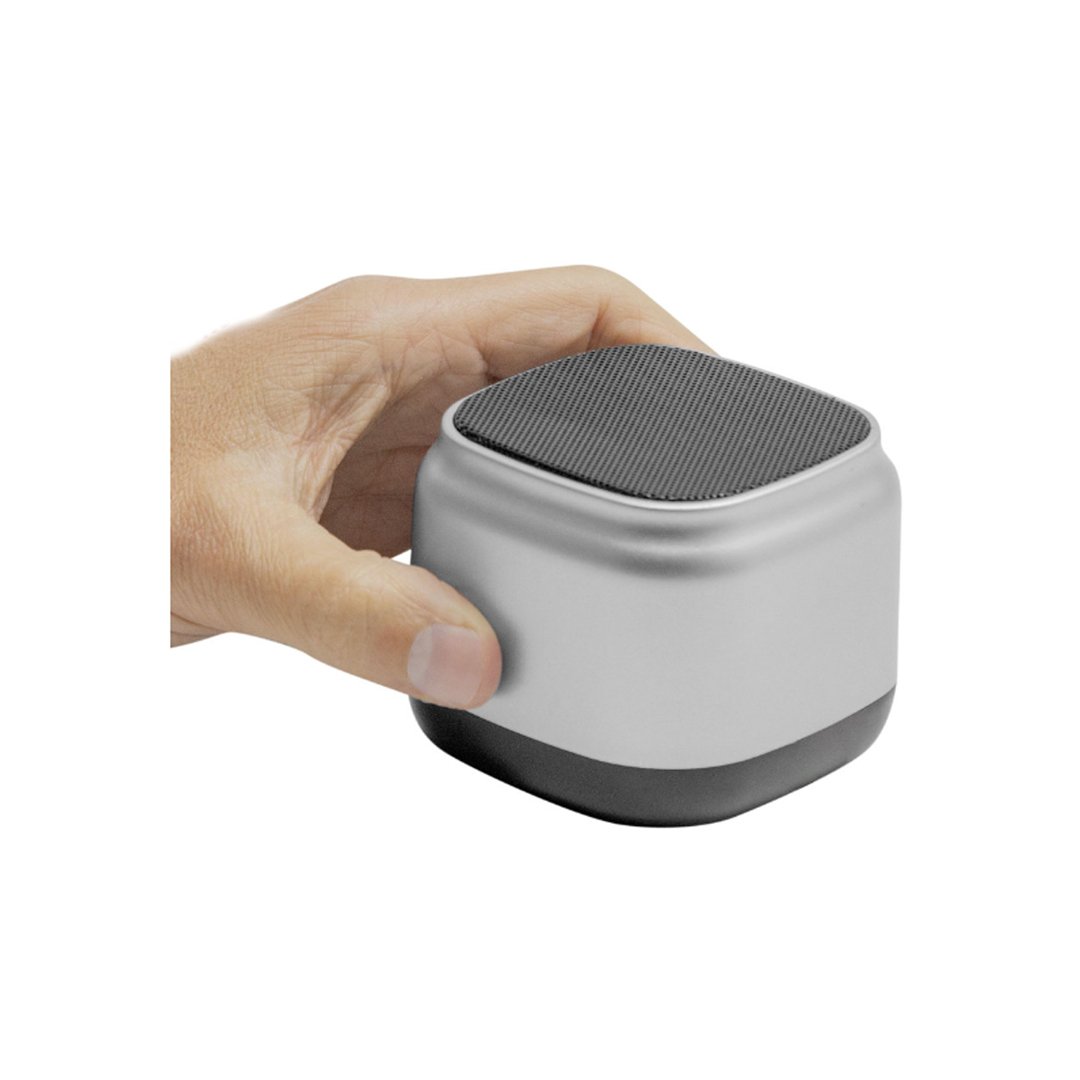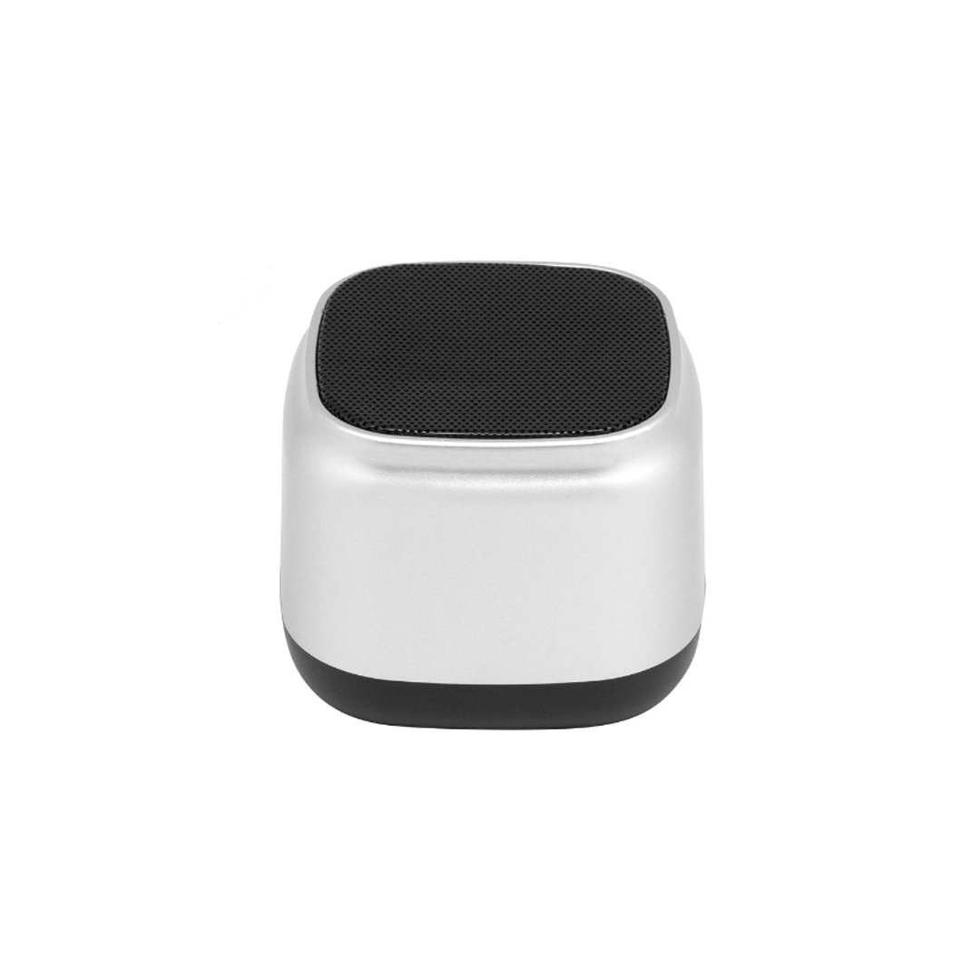 Parlante con medidas 7 x 7 x 5,8 cm. Plastico ABS con pintura al óleo metalizada y metal. Posee botonera de silicona en la base y malla metálica negra en la parte superior. Potencia: 3W. Versión bluetooth: 5.0.La base del parlante es antideslizante. Micrófono incorporado. Permite recibir llamadas. Capacidad de la batería: 800 mAh. Cable de carga y conexión USB tipo C color negro. Presentación en caja de regalo.