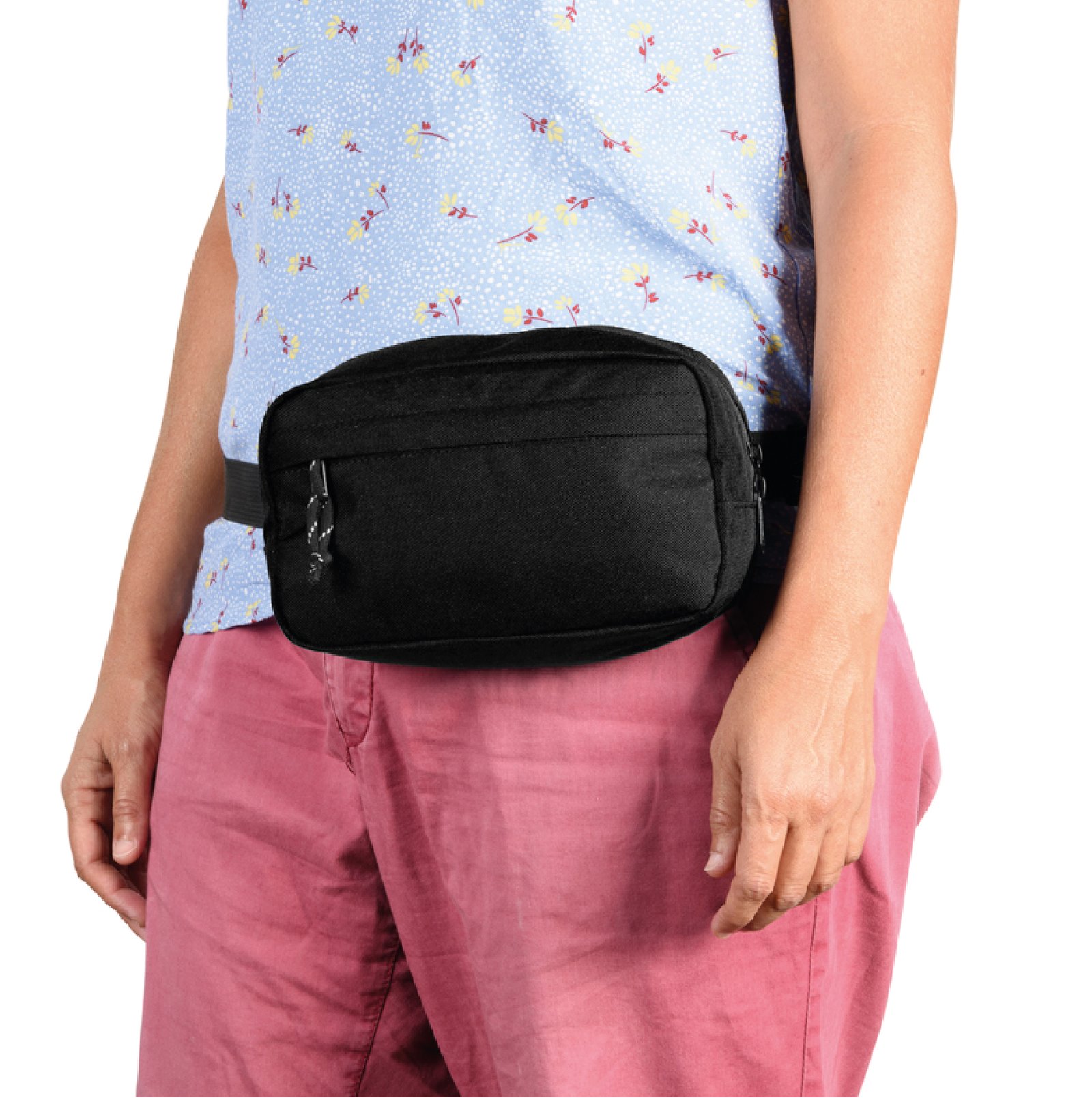 Riñonera de poliéster recicladoFabricada en poliéster reciclado 600D. Cuenta con 1 compartimento principal y 1 bolsillo frontal. Práctica y sustentable, ideal para activaciones urbanas y giveaways funcionales. Tira de 80 cm de largo.