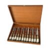 Cubiertos artesanales calidad premium para asado. 6 juegos de cuchillo y tenedor de acero inoxidable marca Schmieden, con cabo combinado en hueso y madera autóctona seleccionada. Presentación en caja de madera lustrada.