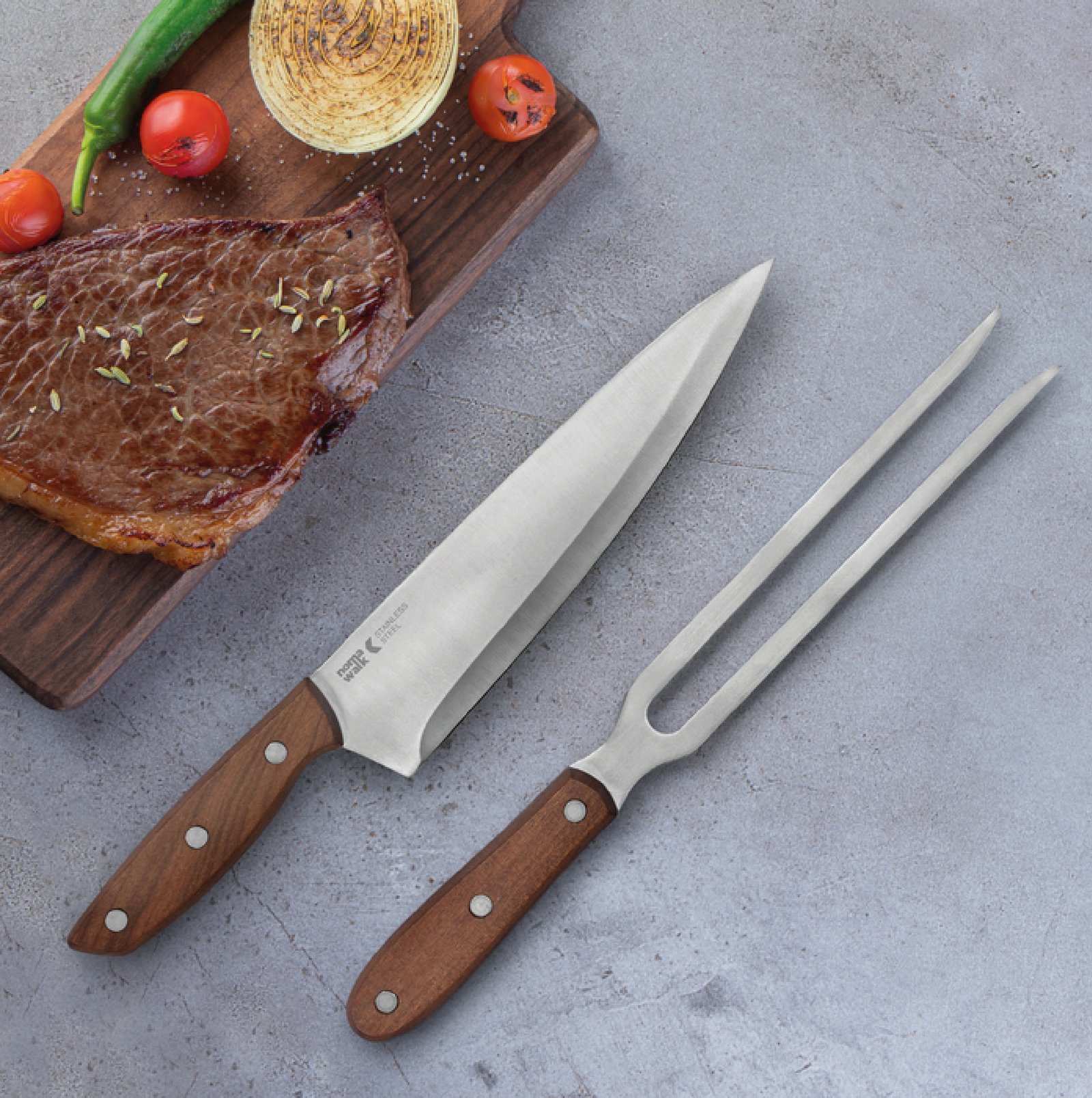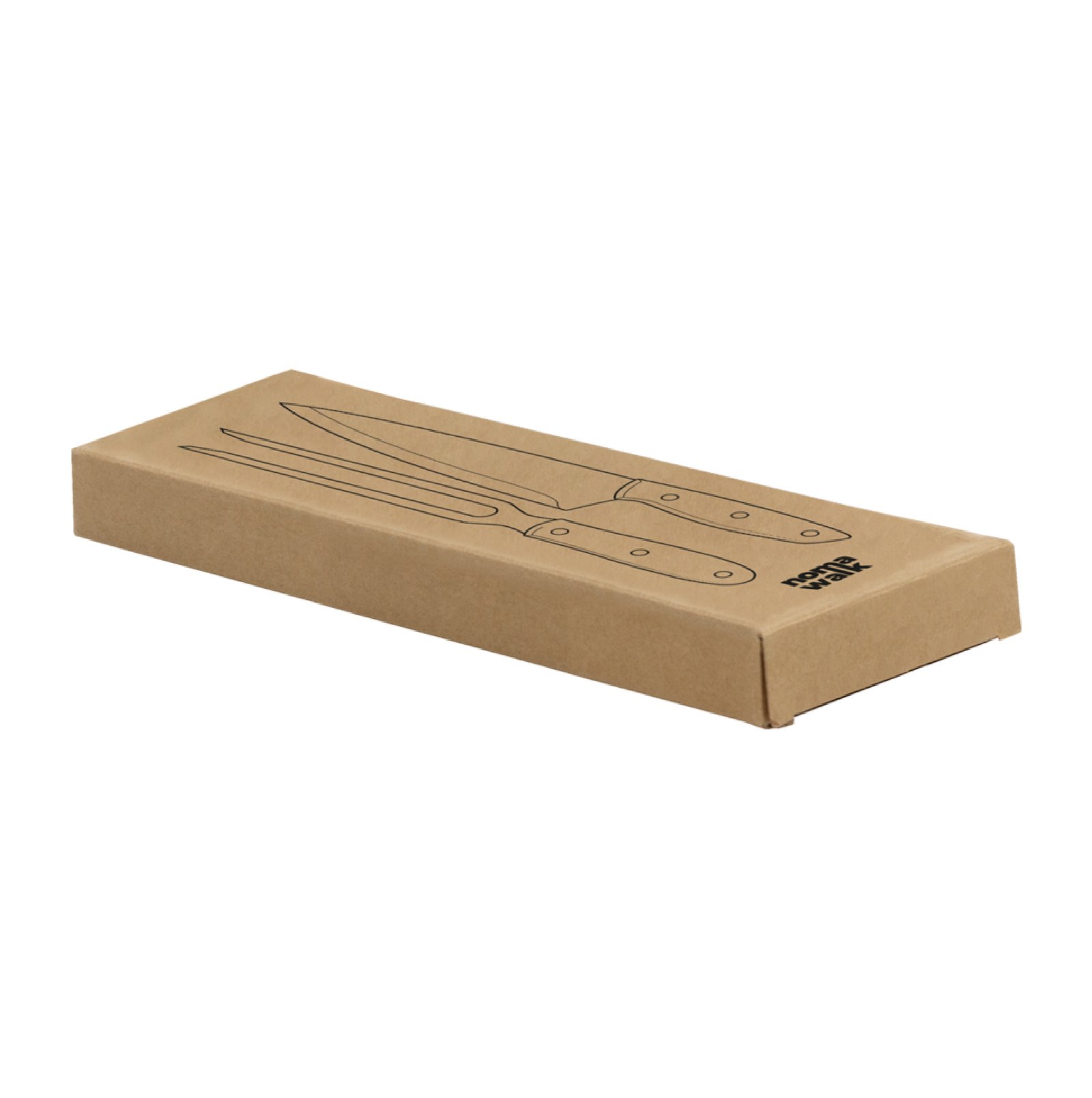 Acero inoxidable 420 y madera. Set de 2 utensilios: tenedor y cuchillo de 31,4 cm, ambos con mango de madera. Presentación en caja de regalo Kraft.