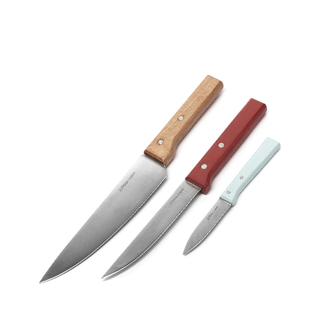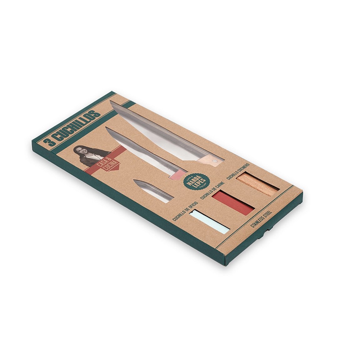 Cuchillos tradicionales de acero inoxidable que se convierten rapidamente en equipos de cocina esenciales para cortar, rebanar y pelar. Cuchillo de oficio de 8cms (3,2) color aqua. Ideal para pelar vegetales y realizar trabajos de precisión. Cuchillo de carne de 15 cms (6,2) color rojo. Hoja firme larga y angosta para realizar cortes en carne asada. Cuchillo de cocinero de 20 cms (8) color natural. Hoja ancha y fuerte ideal para cortar y picar. Packaging de cartón impreso con ventana de pvc cristal. Producto aprobado por el I.N.A.L. para el contacto con alimentos