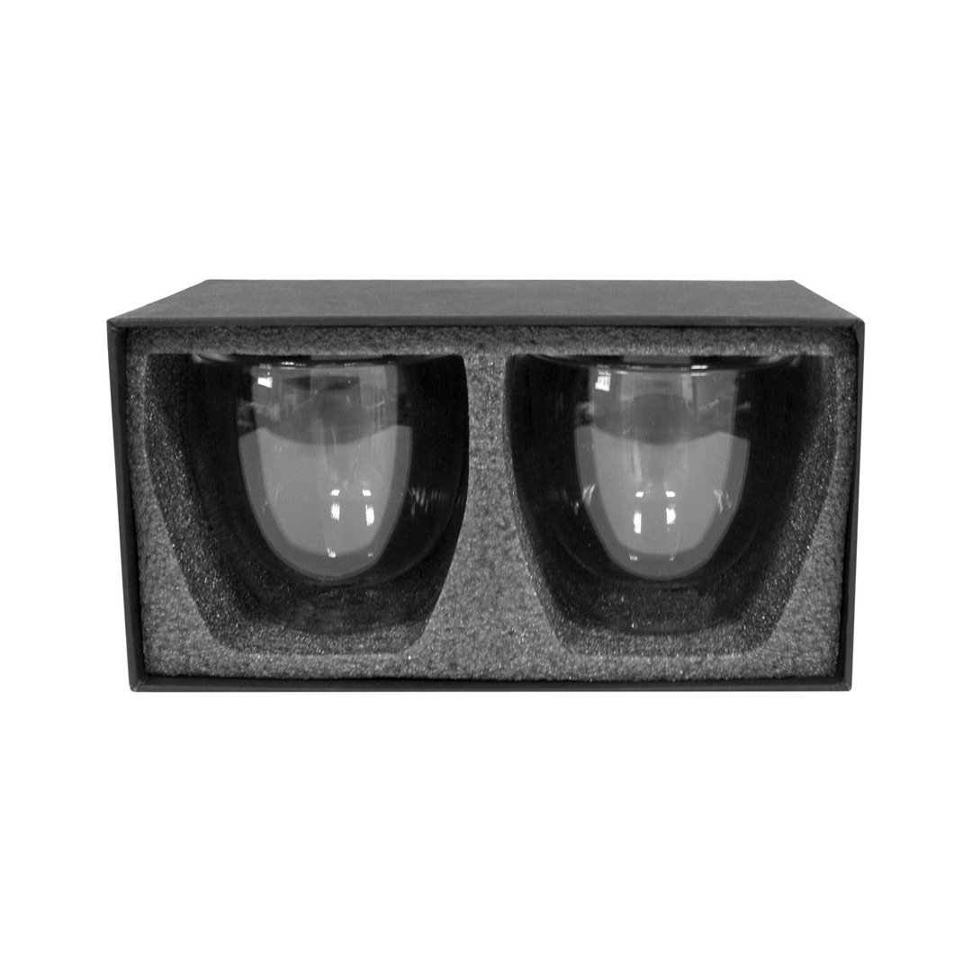 Ø 8 x 8 cm. Capacidad 220 ml cada vaso. Vidrio. Set de dos vasos doble pared. Apto para bebidas frías y calientes. Presentación en caja de regalo.