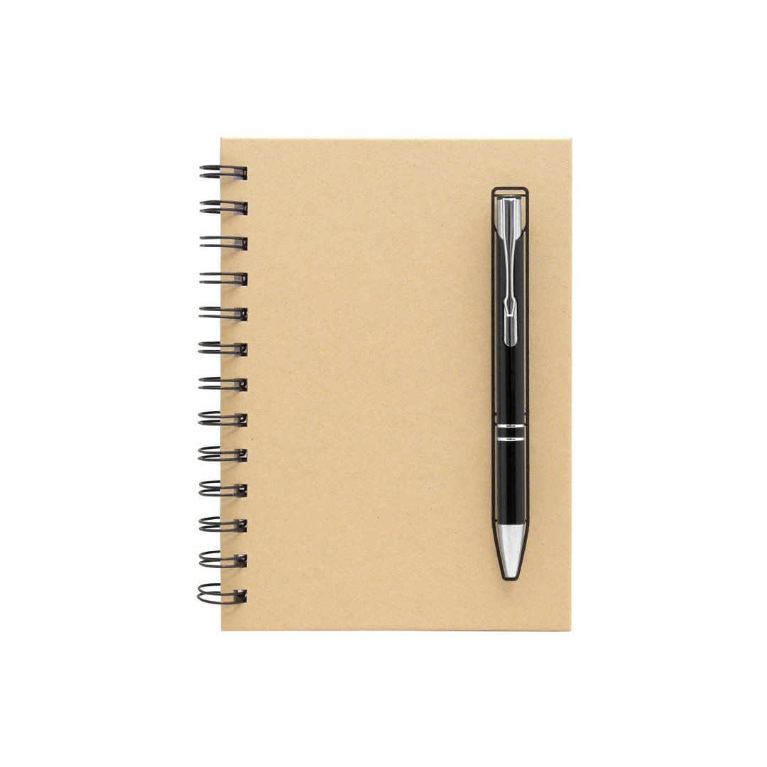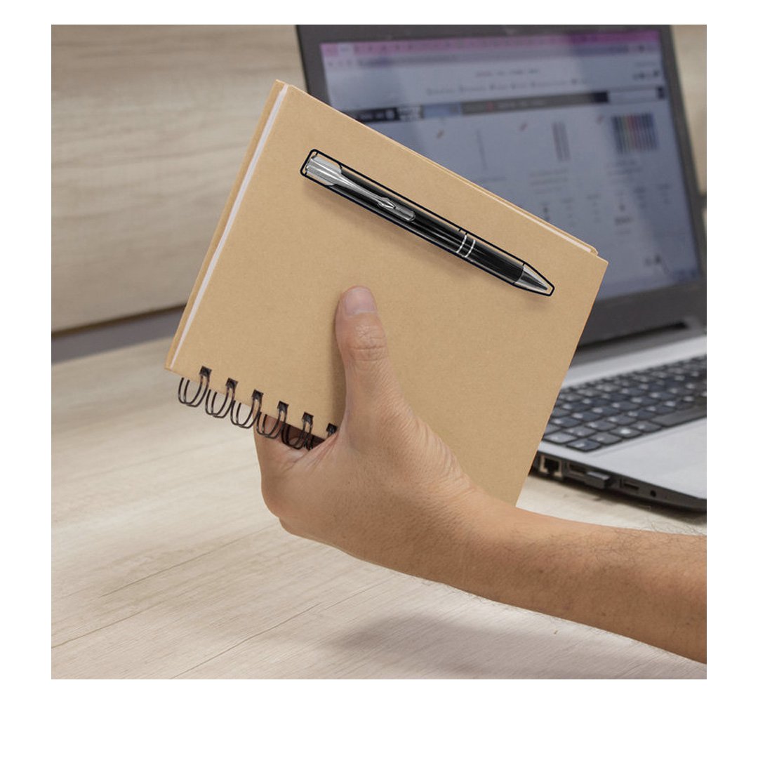 13 x 18 cm. Libreta color Kraft, anillado metálico y 70 hojas punteadas de 70g. Bolígrafo metálico (BP295) color negro con tinta negra. Mediante sistema de imanes el bolígrafo queda sujetado a la tapa, causando un efecto sorprendente.