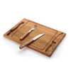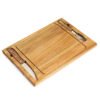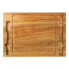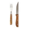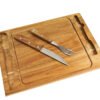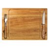 Set de asado con tabla y utensilios. Hecho de madera de acacia y acero inoxidable 420. Cuenta con tabla rectangular con canaleta para jugos, cuchillo y tenedor de acero con mangos de madera, y soporte metálico para mantenerlos en su lugar. Es ideal para cortar y servir carnes con comodidad y estilo, perfecto para reuniones y parrilladas