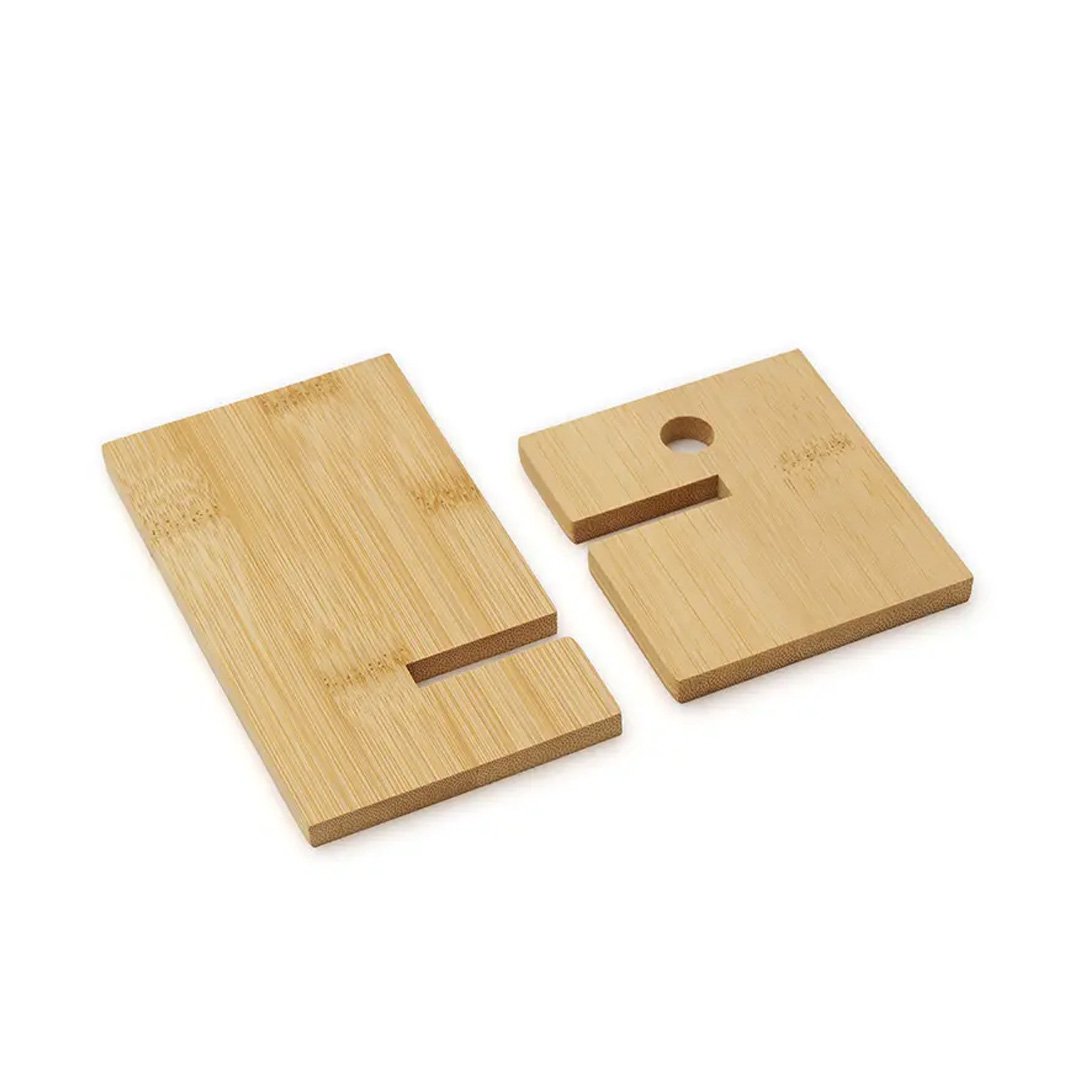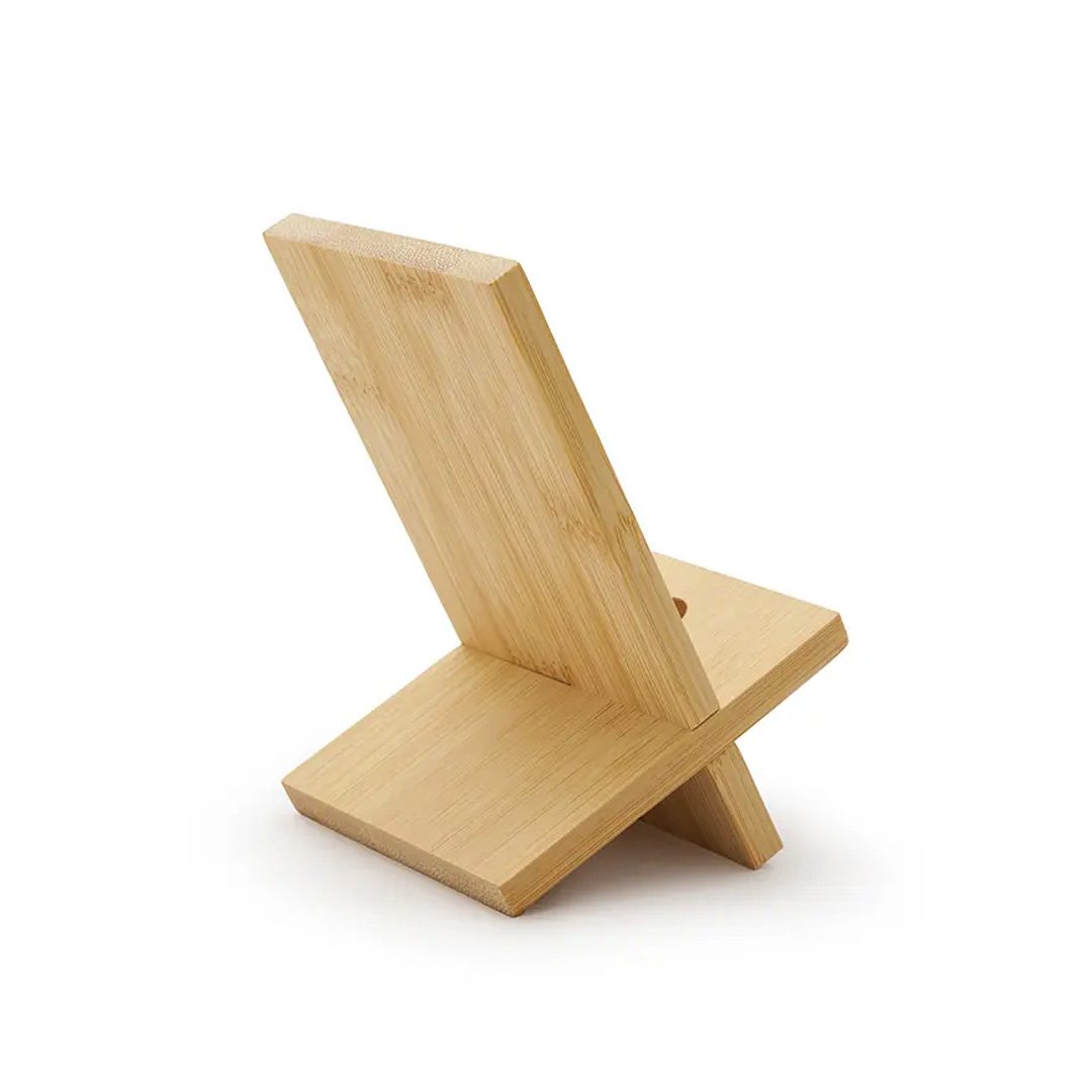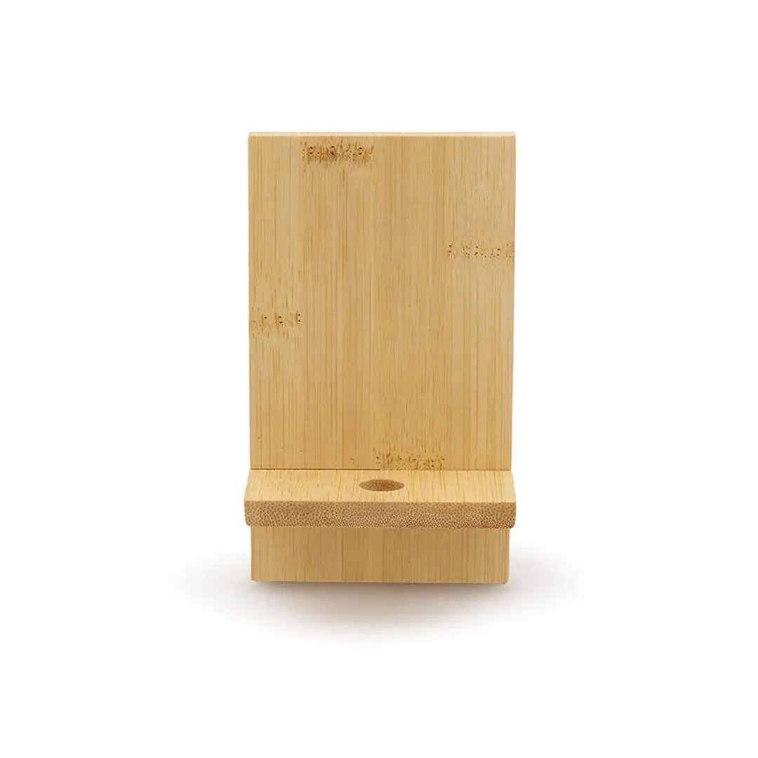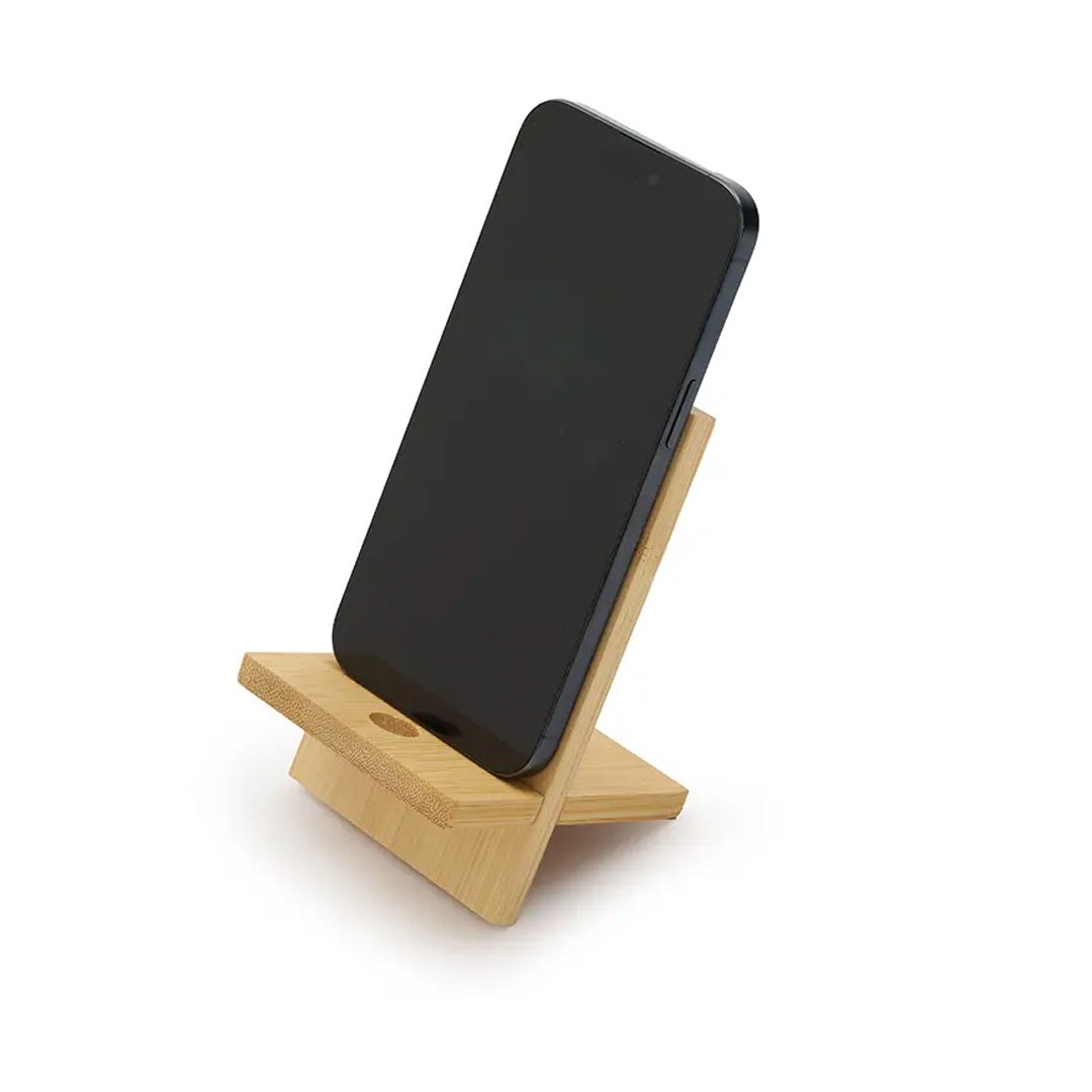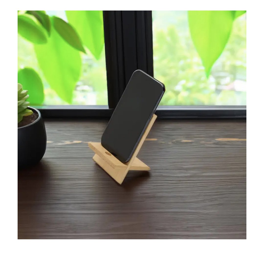 Soporte para teléfono fabricado en bambú. Práctico, liviano y fácil de transportar, es el accesorio perfecto para mantener tu dispositivo estable mientras realizas videollamadas, ves contenido o trabajas cómodamente, tanto en casa como fuera de ella. Además, incluye un orificio que permite el paso del cable facilitando la carga del dispositivo mientras está en uso.