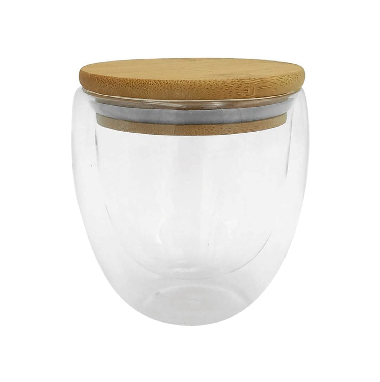 Capacidad 250ml. Vidrio y Bambú. Taza de doble vidrio con tapa de bambú que ademas se puede utilizar como posa taza/vaso. No pasa el calor. Apto para lavavajillas (únicamente la taza) . Presentación en caja de regalo Kraft.