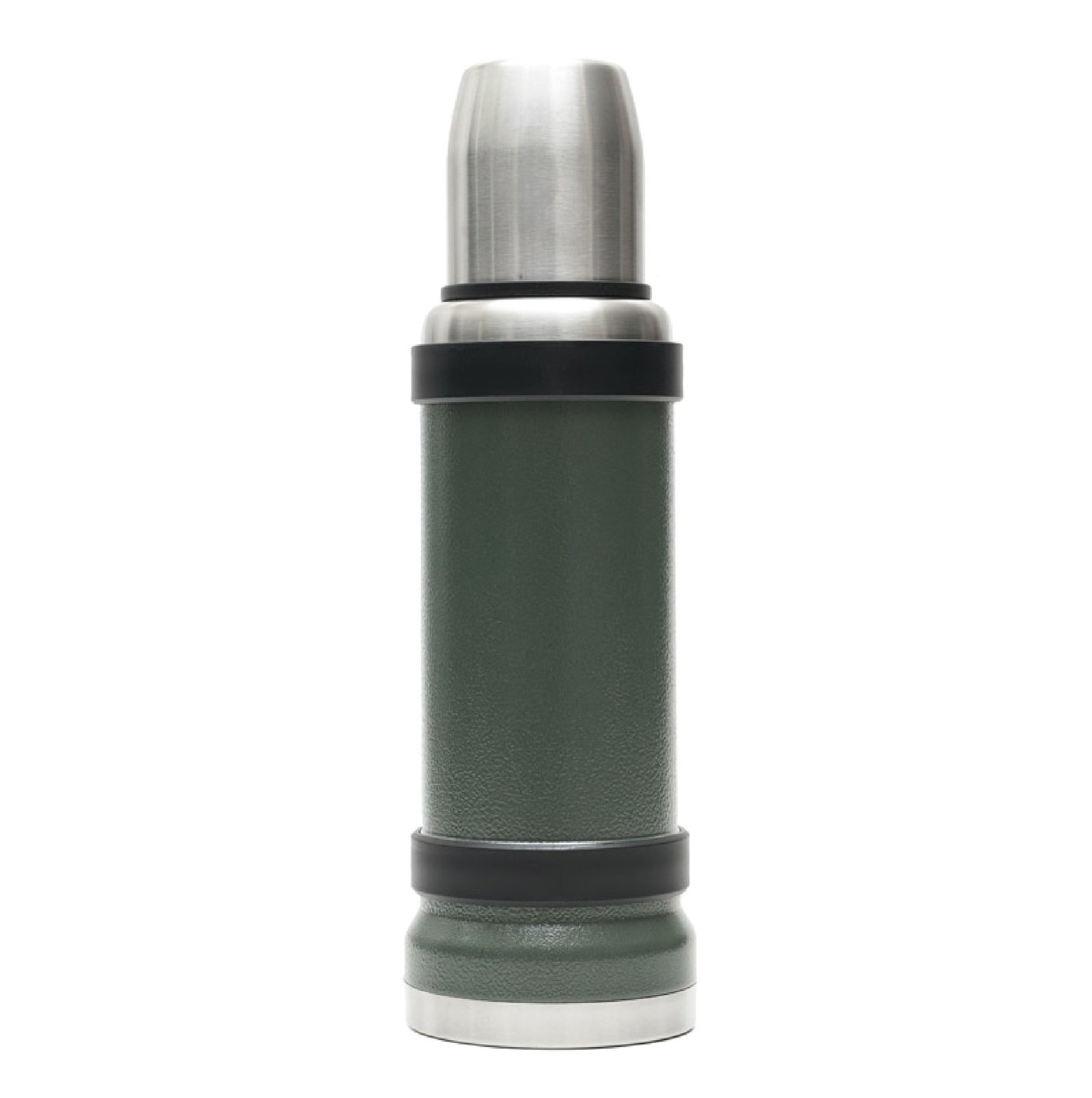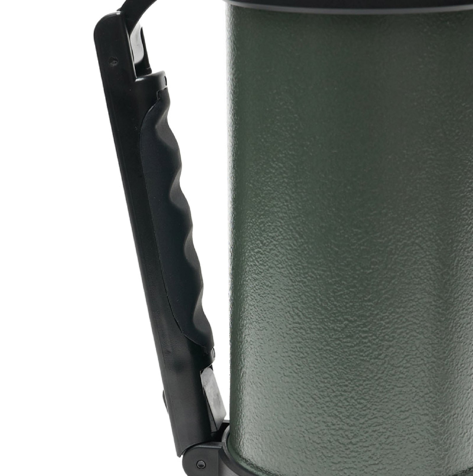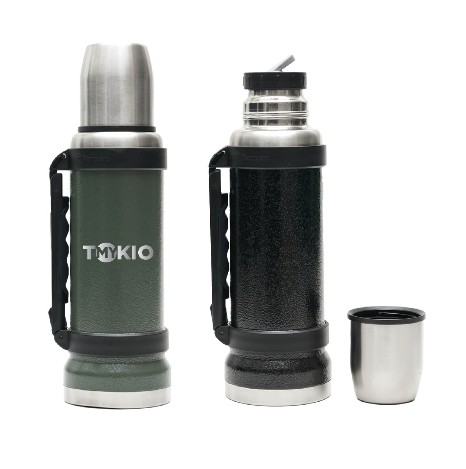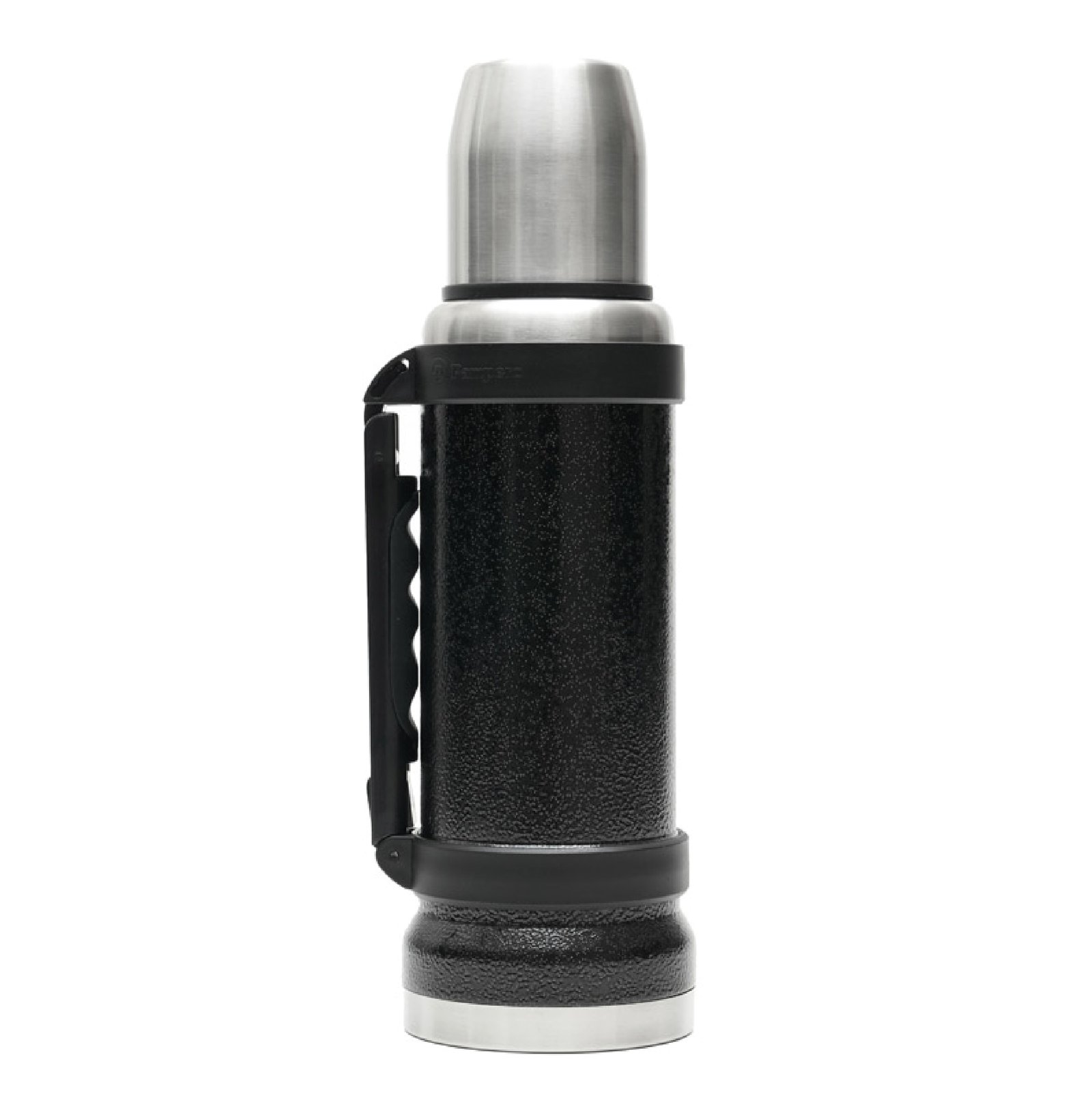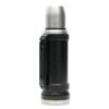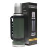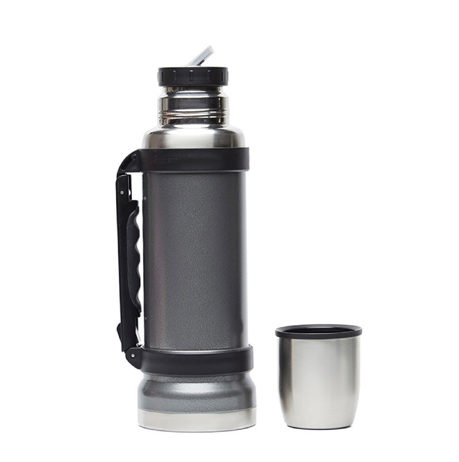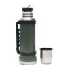 Termo de acero inoxidable 304, recubierto con esmalte especial que protege de ralladuras y golpes. Puede mantener el contenido a la misma temperatura durante 18hs, gracias a su doble pared aislante especial de acero. Cuenta con un tapón cebador Hermético a rosca con la función anti derrame y tapa con superficie plana estable para usar como taza o vaso y manija plegable para facilitar el transporte. Presentado en caja de cartón. Producto aprobado por el I.N.A.L. para el contacto con alimentos. Medidas del termo: 34 cm x 10,5 cm. Medidas de la caja: 35 x 11 x 11 cm. Capacidad: 1,1 Lts