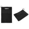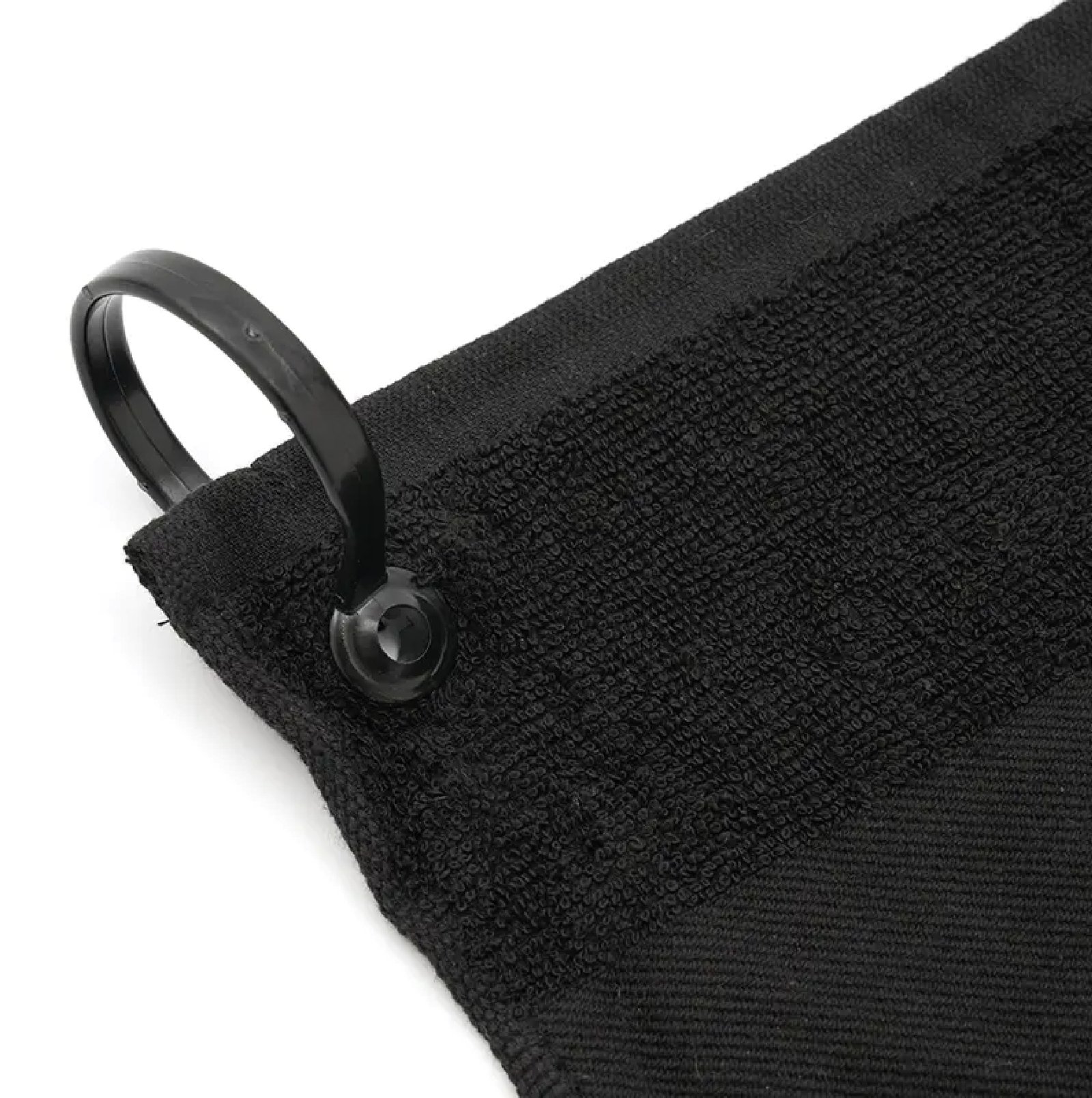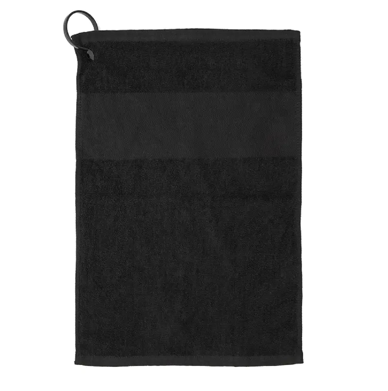 Toalla negra para golf con ojal colgante. Confeccionada en algodón de 400 gramos por metro cuadrado (gsm). Cuenta con ojal metálico con cordón para colgar y franja decorativa central. Es ideal para secar manos, pelotas o palos durante el juego, manteniendo todo limpio y funcional.