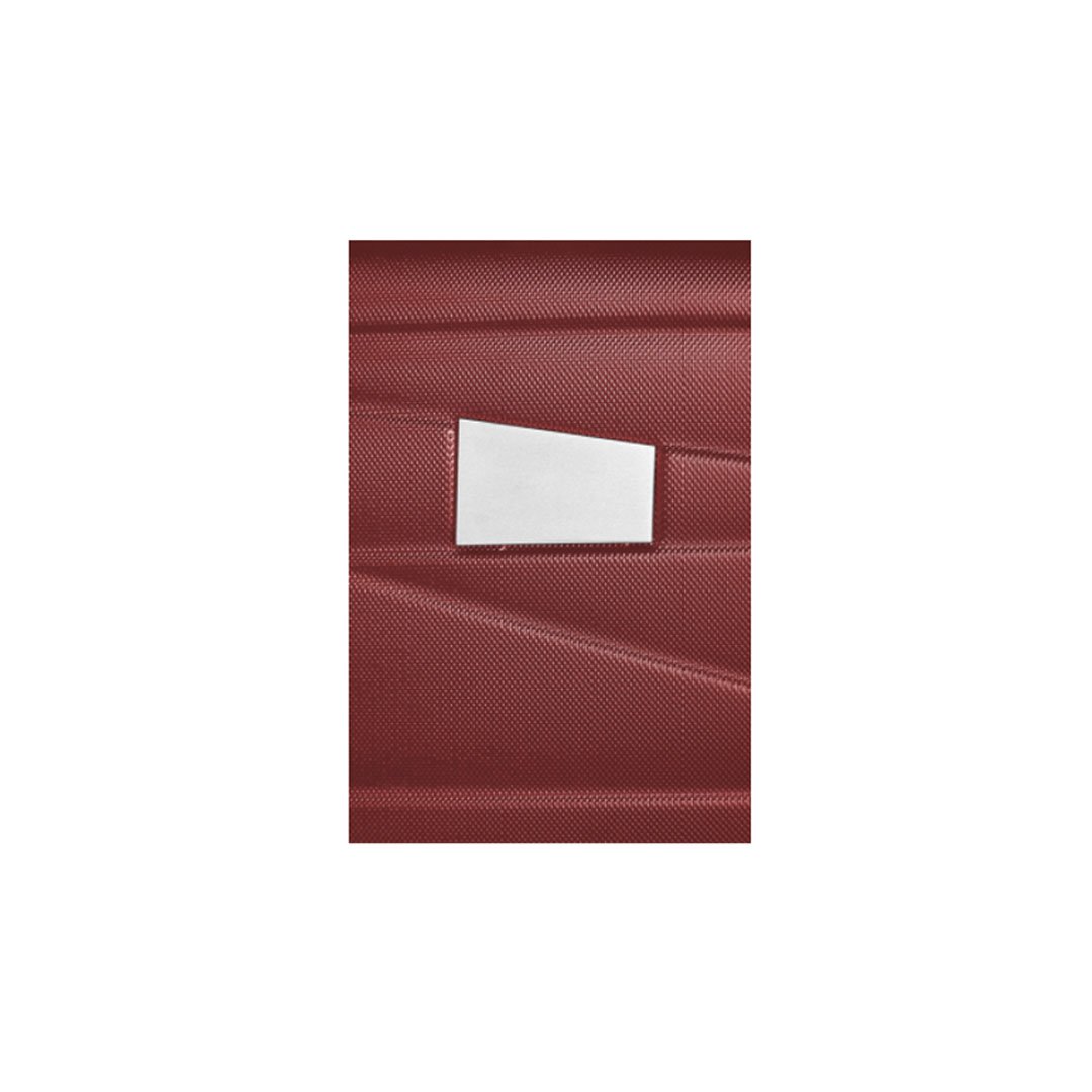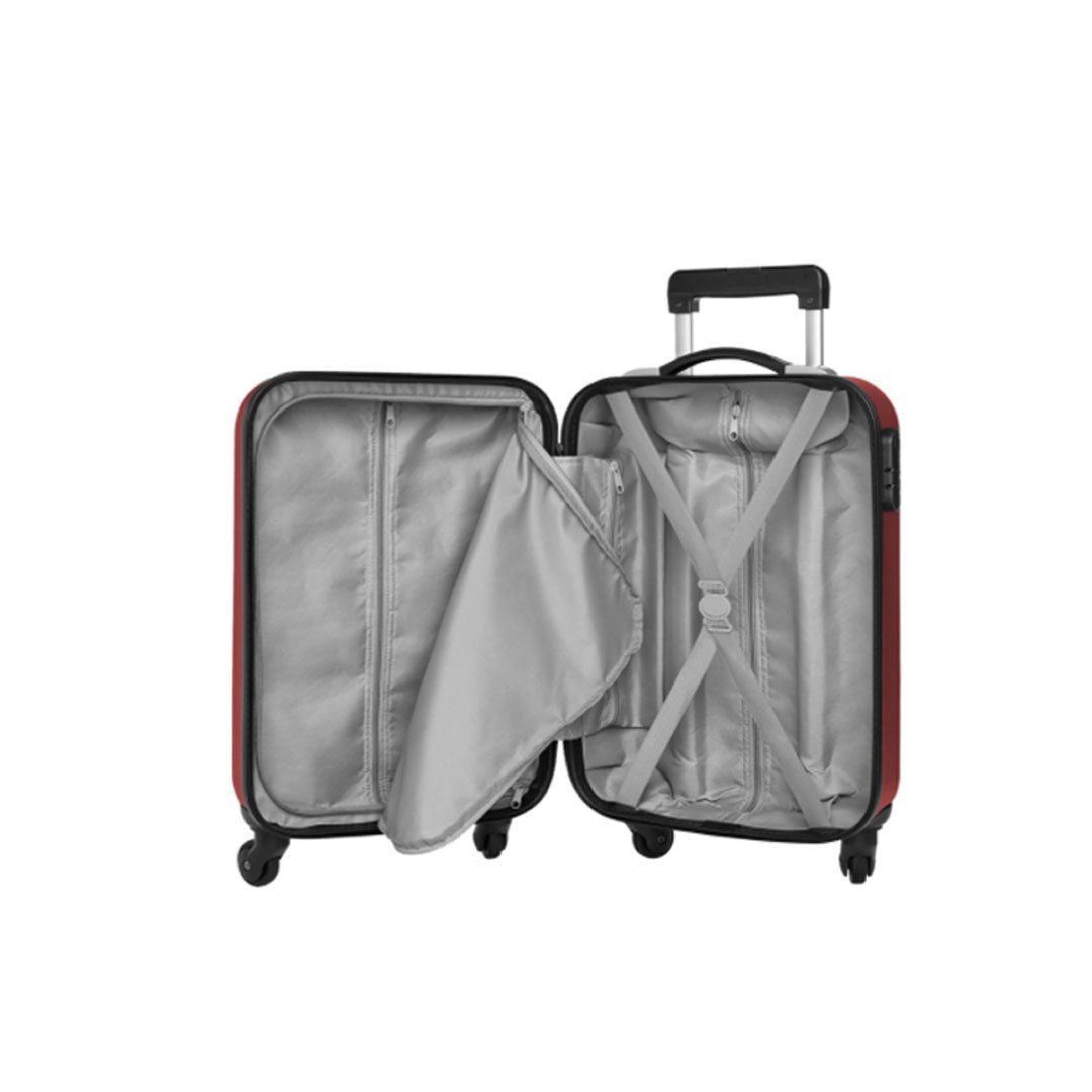 Valija Carry On 55 x 35 x 20 cm. Capacidad 38 litros. ABS. 4 ruedas con giro 360°. Manija de transporte reforzada. Mango extensible hasta 54 cm. 2 posiciones. Interior: 2 compartimentos principales con cierre y elásticos ajustables. Placa metálica desmontable para grabado (medida: 6 x 4 cm.) Candado incluido con combinación.