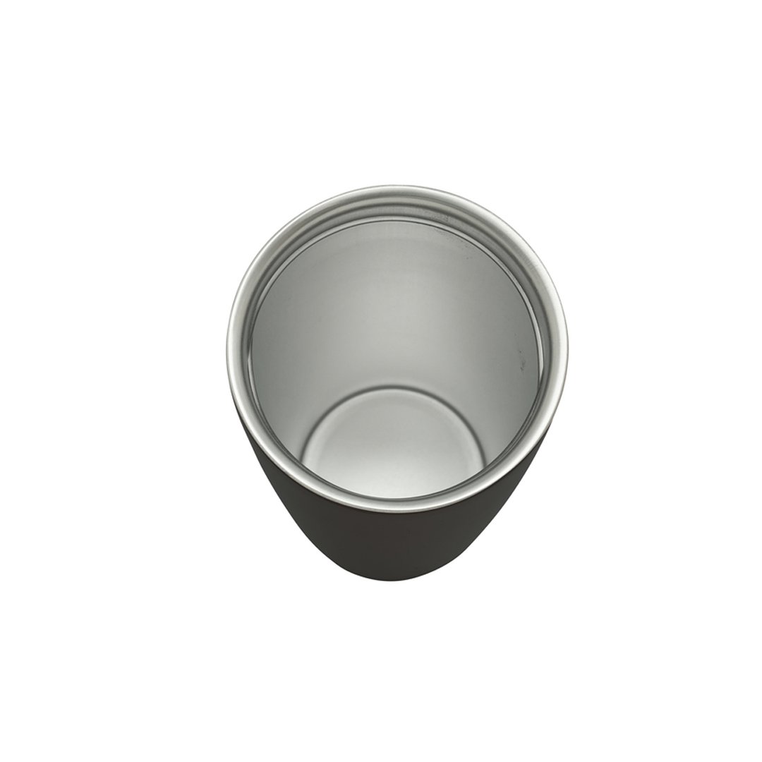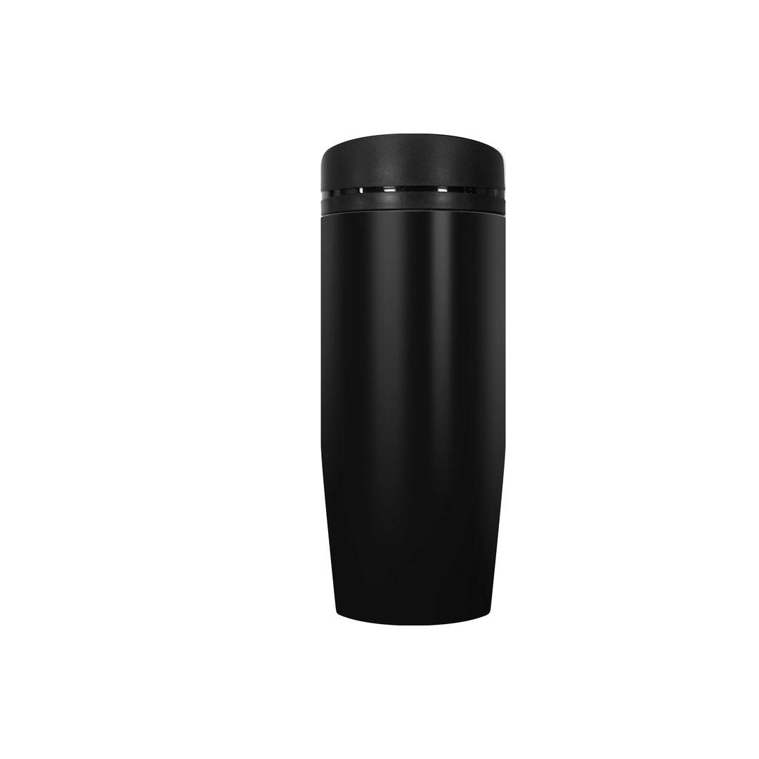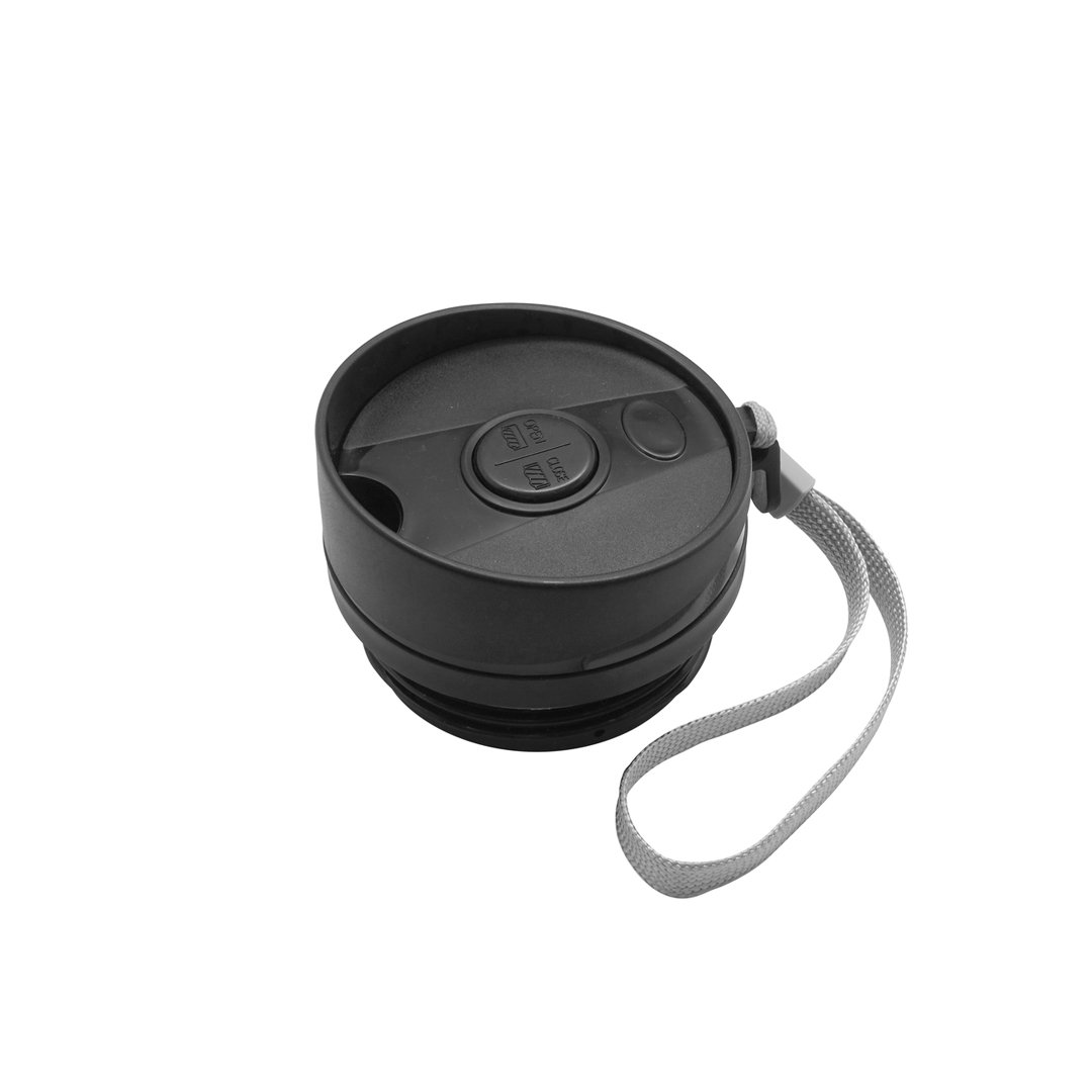 Vaso de acero inoxidable capacidad 350 ml. Vaso con doble pared Interior acero 304 y exterior acero 201. Tapa a rosca, botón para abrir y cerrar. Lazo para sujetar en la muñeca. Base antideslizante. Mantiene las bebidas frías o calientes por más tiempo.