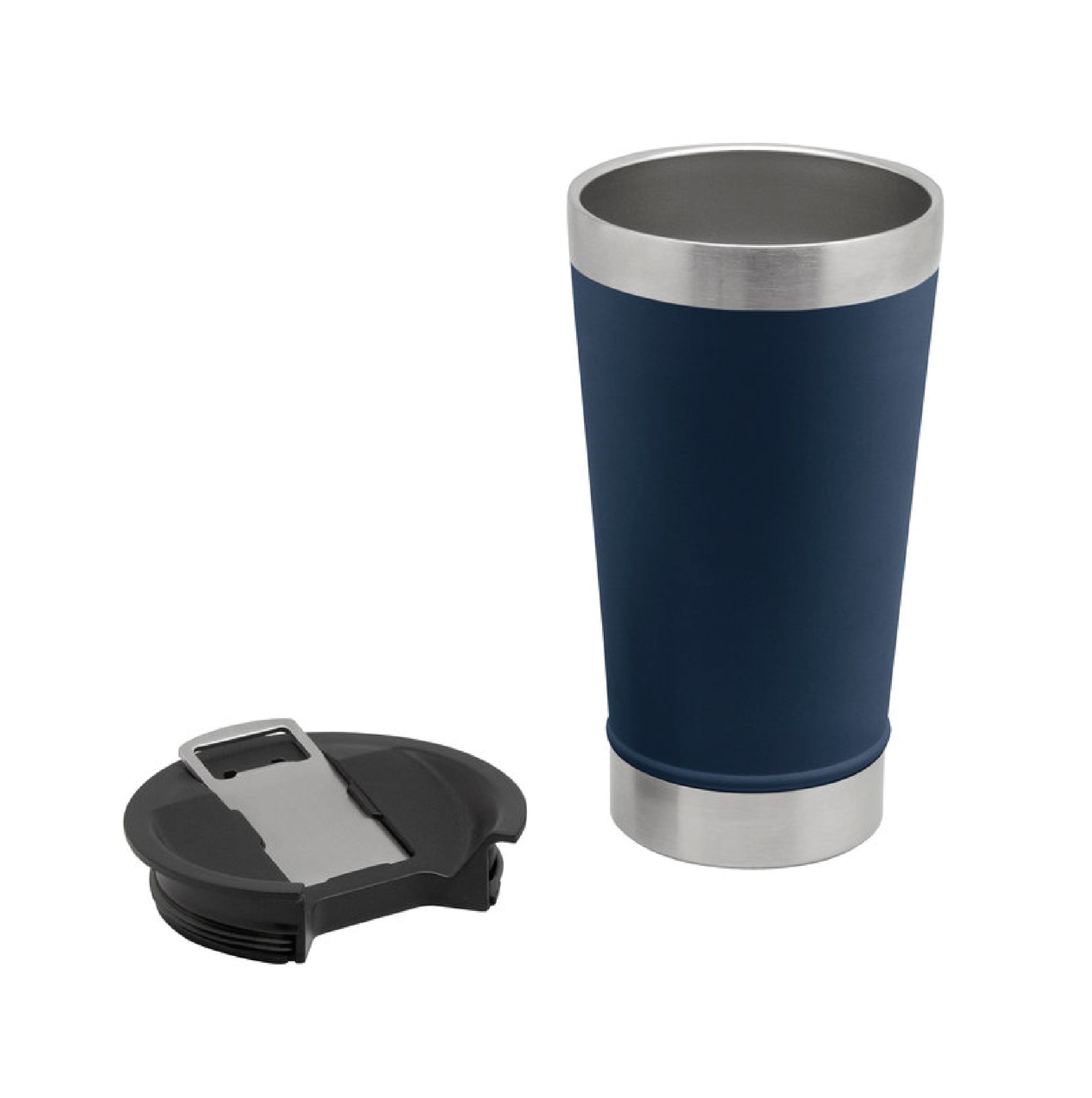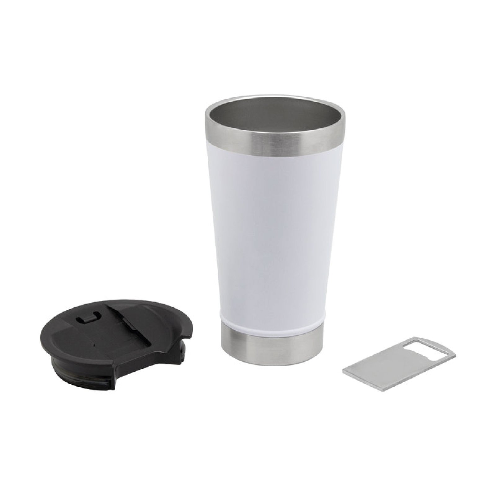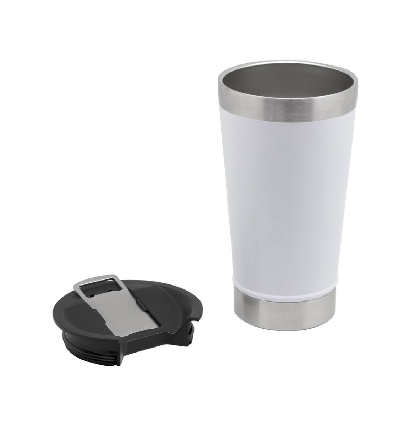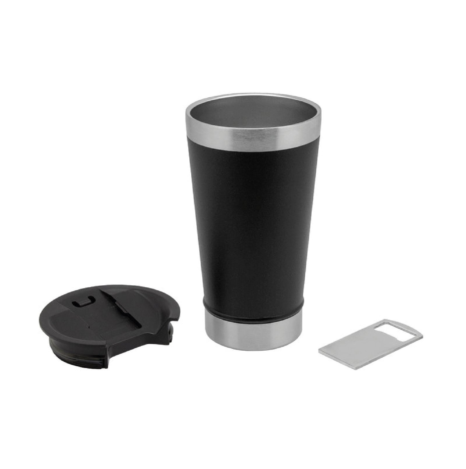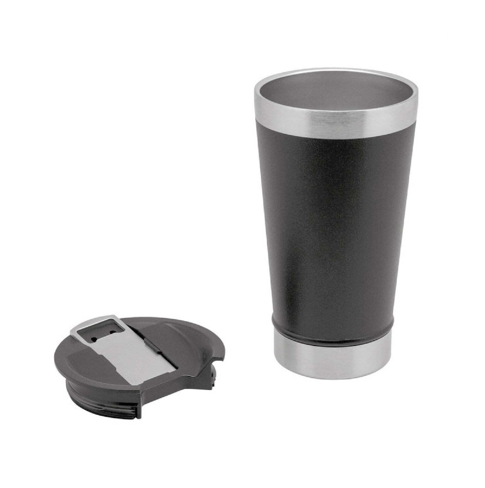 Disfruta de tus bebidas frías o calientes con estilo. Mug doble pared, sellado al vacío. Interior en acero 304 y exterior en acero 201. Tapa plástica con boca ancha a presión con anillo de silicona. incluye abridor de botellas en acero inoxidable 430. Pintura exterior con acabado mate. Mantiene hasta 2 hs la temperatura de las bebidas calientes y 4 hs de las bebidas frías.  Medidas: Ø 7,5 x 17 cm. Capacidad: 500 ml. Materiales: Acero inoxidable + Polipropileno.